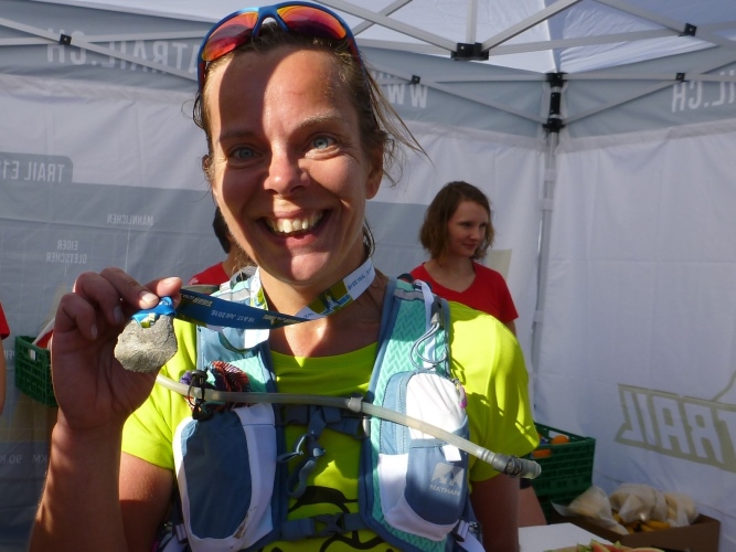 Im Ziel hängt man mir die Medaille um, ein Stück Fels aus dem Wandfuß vom Eiger. Das Finishershirt wird angepasst und dann hole ich mir Getränke, ich habe Durst wie ein Kamel. Kurze Zeit später kommt Bernie, gewaschen, geschnäuzt und gekämmt, ich stinke dagegen wie ein Iltis.