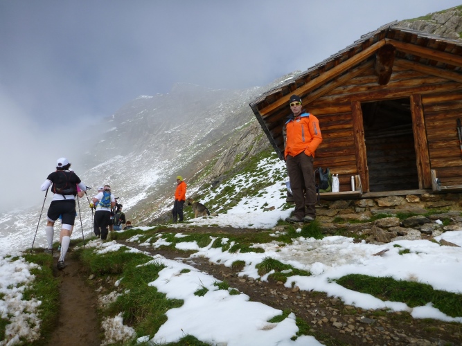 Damit es nicht langweilig wird, warten in dem Abstieg mehrere kurze Gegenanstiege. Der längste, unterhalb von Schilt gelegen, hat über 100 Höhenmeter. Zwei Bergführer hat man da postiert, damit nichts passiert, denn teilweise ist das Gelände abschüssig. Am Ende des Anstiegs wartet eine Bergführerin, die mit Stolz von ihrer Zusatzausbildung zur Hundeführerin erzählt. Ja, an dieser Stelle müssen wir Trailer allen Helfern ausgiebig danken, denn ohne ihre Unterstützung wäre ein solches Event nicht durchzuführen. Mercy und Thanks allen im OrgaTeam.