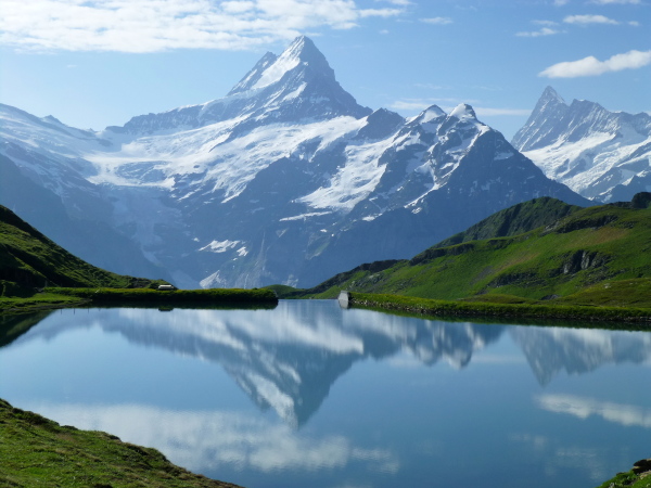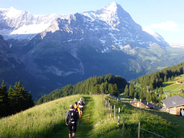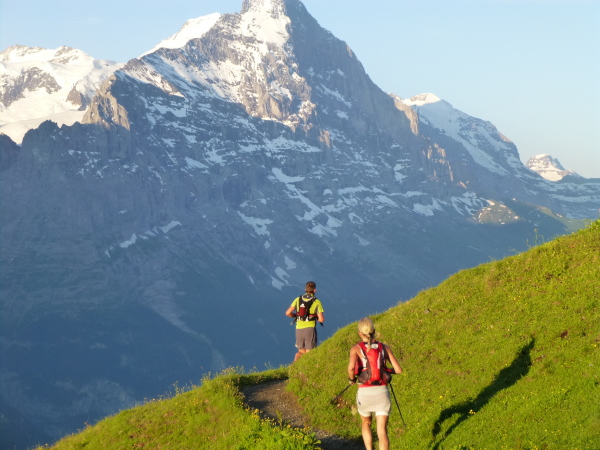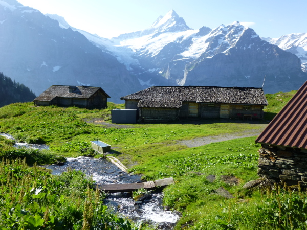 Ein gut belaufbarer schmaler Höhenweg führt jenseits der 2.000 m-Grenze in stetigem Auf und Ab am Hang entlang durch das Alp Grindel. Zu unserer Linken haben wir stets die majestätischen Bergriesen im Blick, die sich jenseits des Lütschinentals erheben. Wie eine uneinnehmbare Festung aus Fels, Eis und Schnee reihen sich Wetterhorn, Schreckhorn und Eiger aneinander.
