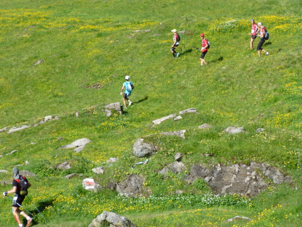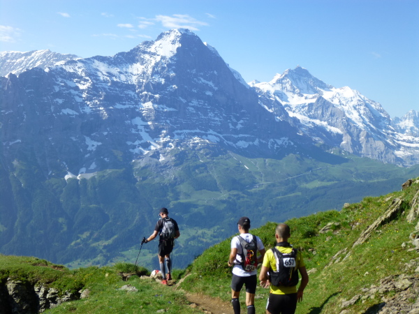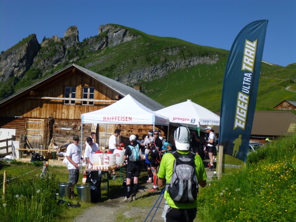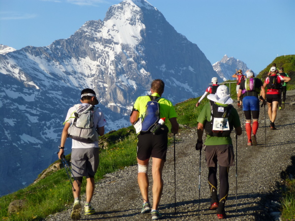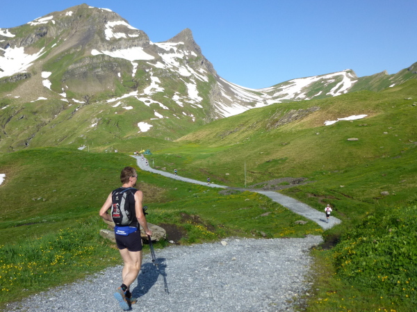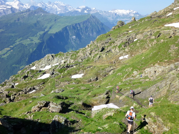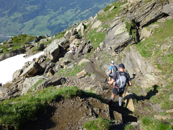 Ein breiter, gut ausgebauter Wanderweg führt vom First aus durch die Weite der Bergwiesen dahin. Auffällig dichter wird der Läuferandrang auf der Strecke. Des Rätsels Lösung: Die E51-Läufer stoßen dazu. Zwar sind sie erst um 7 Uhr in Grindelwald gestartet, doch fehlt die Schleife nach Bort auf ihrem ansonsten auf der ersten Hälfte mit dem E101 identischen Kurs, sodass sie uns hier, zumeist noch deutlich frischer wirkend, eingeholt haben.