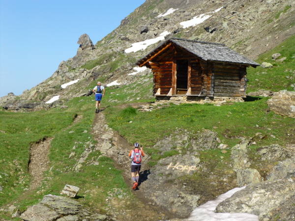 Unser nächstes Etappenziel haben wir von hier gut im Blick: Das Faulhorn. Und dieser Blick ist respekteinflößend. Da sollen wir hinauf? Das Faulhom ist mit einer Höhe von 2.680 m üNN, gemessen an den Bergen auf der anderen Talseite, wahrlich kein Gigant. Doch aus läuferischer Sicht kommt er einem durchaus so vor. Etwa 600 Höhenmeter sind auf den nächsten drei Kilometern zum Gipfel zu überwinden. Daher sollte man an der pittoresk vor der Berghütte postierten Verpflegungsstation an der Bussalp ausgiebig "tanken".