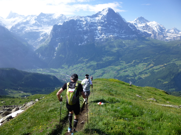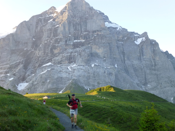 Der First ist für uns gleich doppelt Durchgangsstation. Dazwischen liegt eine 9 km-Schleife. Und die hat es in sich. Nach einer kurzen Stärkung an der Bergstation stürzen wir über einen breiten geschotterten Fahrweg über 650 Höhenmeter durch das offene Gelände gen Tal. Das geht in die Beine, doch lasse ich mich von den anderen Läufern anstecken und gebe Gas. Die Wiesen fliegen nur so an mir vorbei und ich ahne schon: Das werde ich noch büßen müssen. Stets im Blick habe ich den Eiger, der mittlerweile im Sonnenlicht voll erstrahlt. Wie von einem endlosen Balkon blicke ich hinüber und lasse mich gerne immer wieder in seinen Bann ziehen. In Bort (1.501 m üNN, km 17,4) hat unser Sturzflug ein Ende und wir kehren auf den harten Boden der Realität zurück. Und die verheißt: All die verlorenen Höhenmetern dürfen wir im Aufstieg wieder abarbeiten.