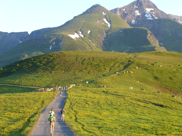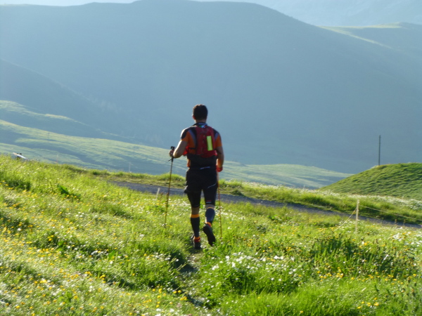 Ich bin geradezu euphorisiert. Wie weggeblasen ist der Stress des Anstiegs. In einem unglaublich intensiven Grün erstrahlen die sanft geschwungenen Grasmatten der Almen, nicht minder eindrucksvoll sind die schemenhaften Silhouetten der Bergketten im Gegenlicht, zwischen denen noch vereinzelte Nebelkissen wabern. Ein breiter Naturweg führt relativ flach durch die Bilderbuchlandschaft, sodass zum optischen Genuss auch die pure Entspannung beim Laufen tritt. Gebremst werde ich nur durch eine große Kuhherde, die das ungewöhnliche Gewese zur frühen Morgenstunde mit irritiertem Muhen quittiert, freilich den Laufweg nur widerwillig räumt.