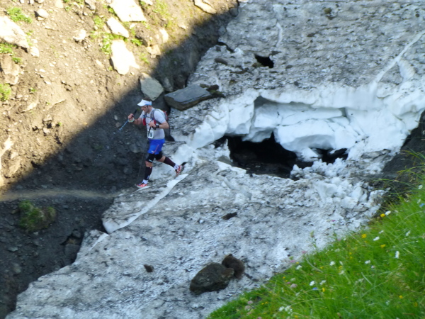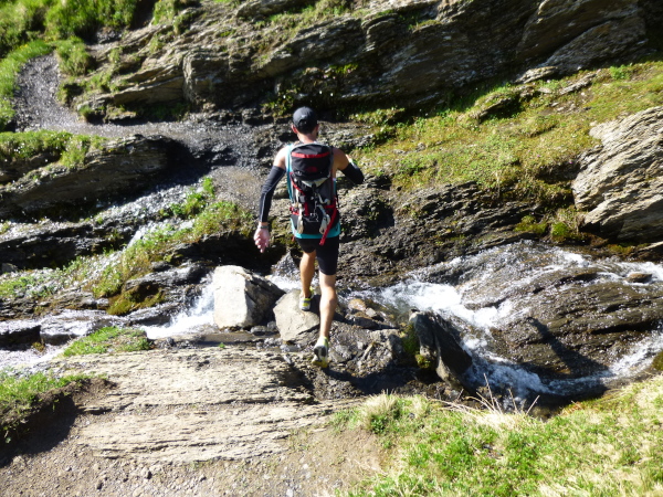 Ich stürze mich sofort auf die Verpflegungsstation (km 22,7) und bringe kaum etwas von dem leckeren kräftig-deftigen Bergkäse und dem Trockenfleisch, eine Spezialität eines lokalen Metzgers, wie man mir sagt, hinunter. Dafür kippe ich kamelartig einen Becher Flüssigkeit nach dem anderen hinein. Habe ich jemals schon so geschwitzt?