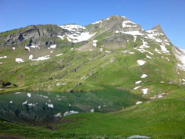Und auf einmal ist er da: Wildromantisch und einsam liegt der Bachalpsee 2.265 m üNN inmitten der Bergwelt. Das Panorama des stillen Bergsees vor den von ewigem Eis bedeckten Riesen der Berner Alpen, sich im Wasser spiegelnd, ist einfach nur kitschig schön. Kein Wunder, dass dies eines der beliebtesten Postkarten und -Fotomotive der Region ist. Der See selbst besteht aus zwei Teilen, wobei der kleinere sechs Meter und durch einen Naturdamm getrennt unter dem größeren Teil liegt. Direkt über diesen Damm führt unsere Laufstrecke.