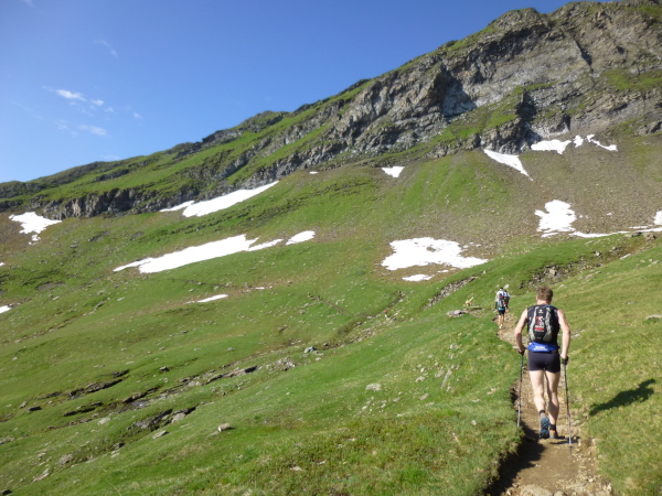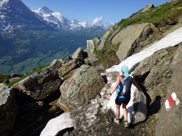 Traumhaft schön geht es weiter. Der bequeme Wanderweg mutiert zu einem ausgesetzten Pfad, der durch Fels und vereinzelt Schnee führend unsere volle Konzentration erfordert. Aber es macht einfach Spaß, gämsengleich über Steine und kleine Bäche zu springen. Einfach nur grandios ist erneut das Panorama auf die Drei- und Viertausender des Berner Oberlands.