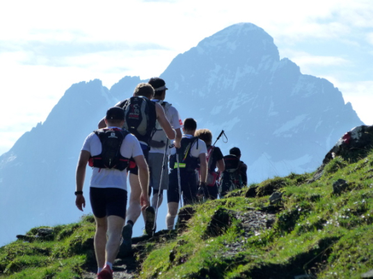 Das Plateau des First kommt in Sicht. Ich frage mich nur, wie wir die dazwischen liegende Steilwand bewältigen sollen. Erst beim Näherkommen weiß ich: Es gibt einen Weg, auch wenn er zunächst primär nur durch die bunten Punkte auszumachen ist, die sich langsam darauf fortbewegen. Und dieser Weg führt mitten hindurch. Ein steiler felsiger Pfad windet sich, zum Glück im Schatten, in Spitzkehren den Abhang hinauf. Tief schnaufend schleppe ich mich nach oben. Am Rande des Plateaus werden wir schon mit Anfeuerungsrufen begrüßt.