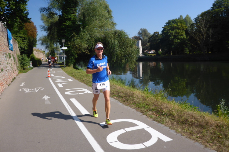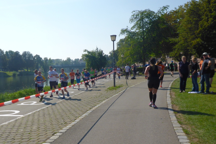 Der 1349 errichtet Metzgerturm war früher Schlachthaus, leider hat man zu spät gemerkt, dass der Untergrund sumpfig war. Er neigt sich mittlerweile über 2 m, was ihm auch den Beinamen „schiefer Turm von Ulm“ eingebracht hat. Aber er steht noch, und das ziemlich stabil, also was will man mehr? Auf dem Kopfsteinpflaster muss ich höllisch aufpassen. Ich bin froh, als ich unfallfrei unten an der Donau wieder auf den 10 km Lauf stoße. Die 10er laufen hier rechts. Ich dagegen werde links geleitet. Mein Weg führt etwas oberhalb des Ufers entlang, während ich direkt am Kai Marathonläufer mir entgegen kommen sehe. Kurz darauf gelange ich ebenfalls nach unten. Dort ist der Weg einfach in der Mitte geteilt und mit Pylonen markiert. Meine Strecke führt jetzt ortsauswärts, auf demselben Weg muss ich später zurück.