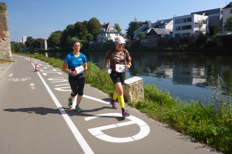 Am Donaucenter vorbei erreichen wir die Donau. Es geht am Ufer entlang. Gegenüber spiegelt sich die Altstadt von Ulm im ruhigen Wasser. Hinter der Grünanlage befinden sich die Donauklinik und dann das Kongresszentrum Edwin-Scharff-Haus. Eine Zwei-Mann-Band intoniert deutsche Schlager. Nun kündigt ein Schild die Streckentrennung für Halbmarathon und Marathon bei km 19 an. Zwei Schlachtenbummler motivieren nochmal jeden Einzelnen. Ich werde geradeaus geleitet. Schnelle Läufer kommen von vorne, ich kann gar nicht so schnell fotografieren, wie sie vorbei sind. Das sind Marathonläufer bei ca. km 33. Für mich kommt hinter der Kurve eine VP.