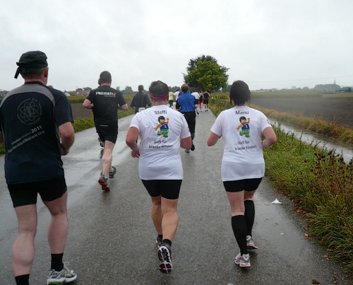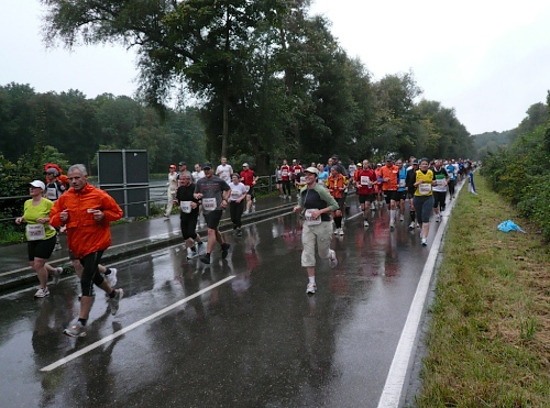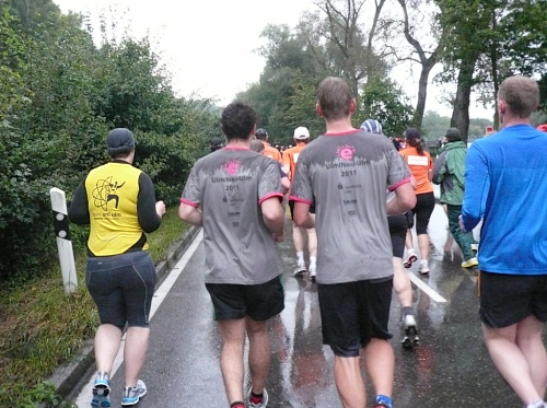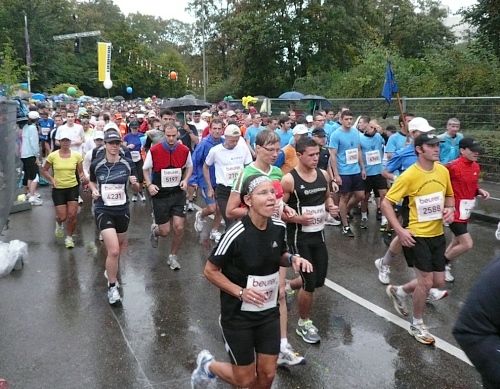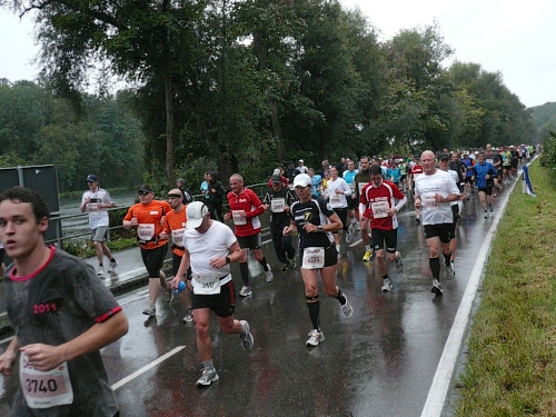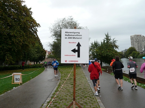 So, es ist 9 Uhr und der erste Block wird losgeschickt. Kurz danach startet der zweite Block und dann der Rest. Es gehen 661 Marathonis und 4.321 Halbmarathonis auf die Strecke. Hinter uns starten anschließend 264 Power- und Nordic-Walker über 21km. Alle anderen Starts erfolgen um die Mittagszeit in der Innenstadt, außer den Kinderläufen, die waren schon am Samstag im Donaustadion. Es geht recht gemächlich los und so zieht sich das Feld langsam auseinander auf der breiten Böfinger Straße. Der Schwabe sagt dazu auch „No net hudla“, was so viel heißt wie „immer mit der Ruhe“.