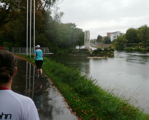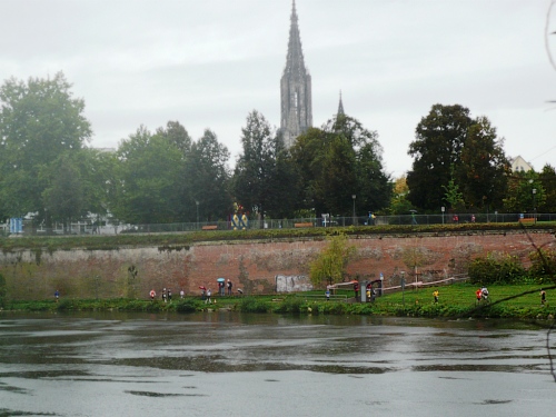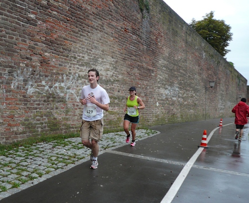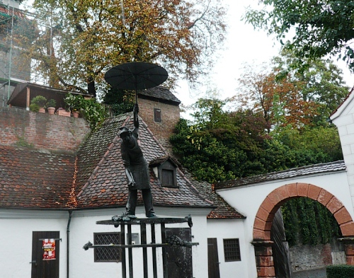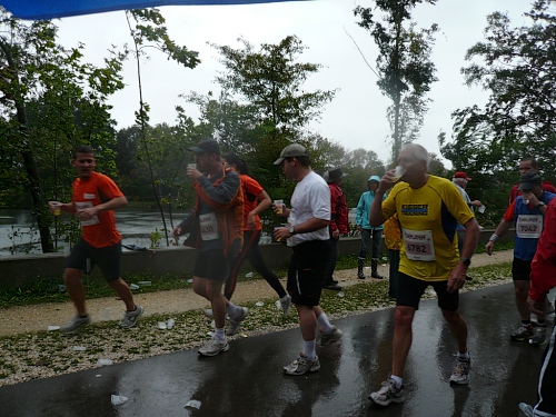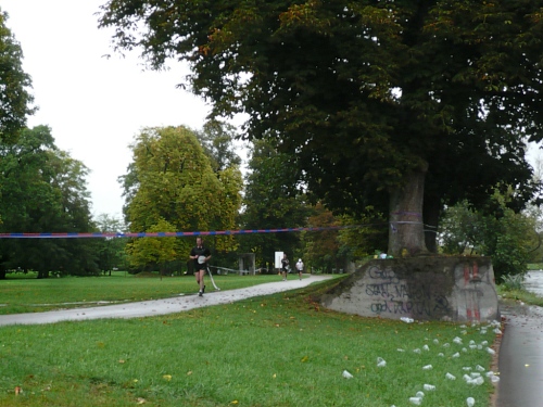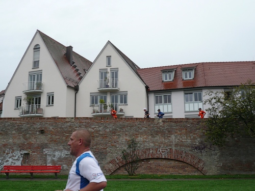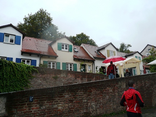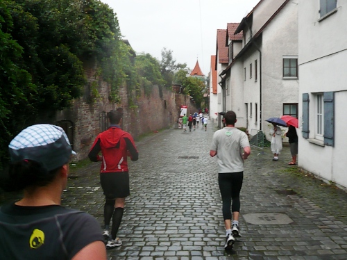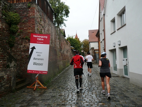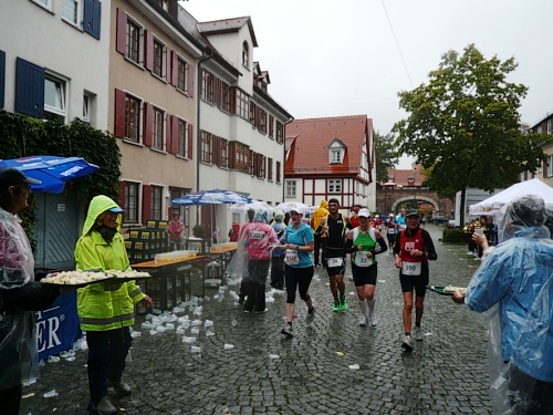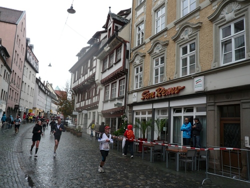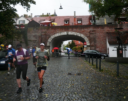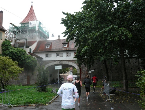 Es geht einmal um den Seelengraben rum und schon sind wir bei Km14. Beim Blick nach links oben sehen wir ein paar dieser kleinen Grabenhäusle. Kurz danach kommt die nächste Versorgungsstelle und das erste Drittel vom Marathon ist geschafft. Hier steht auch Gudrun mit ihrem Lauftreff und versorgt die Läufer mit klammen Fingern. Es ist schon toll, trotz des Regens und der Kälte haben die Helfer alle gute Laune. Wir kommen wieder auf die Gänstorbrücke. Hierbei umlaufen wir leider nur das Zeughaus sowie das Einstein-Denkmal. Dort, wo wir von der Gideon-Bacher-Straße auf die Neue Straße abbiegen, liegt in unserem Rücken der Gänsturm, einem um 1360 erbauten 37,5m hohen Torturm. Früher wurden durch dieses Tor die städtischen Gänse auf die Gänswiesen getrieben.