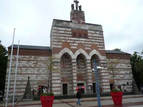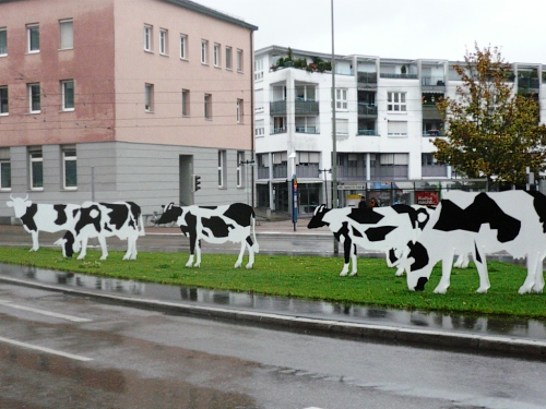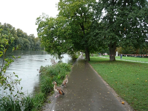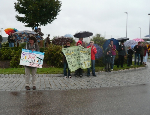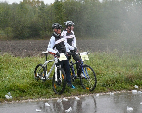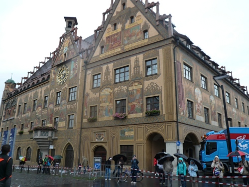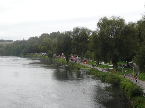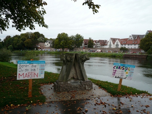 Weiter geht’s nach Pfuhl, einem Stadtteil von Neu-Ulm, nicht zu einem flachen Dorftümpel, wie ihn die Norddeutschen bezeichnen oder die Franken zu Jauche sagen oder Luther den Ort der ewigen Verdammnis nannte. Während Luther predigte, war Pfuhl schon 500 Jahre alt, was Reste von Ausgrabungen bei der Kirche St. Ulrich bestätigten. Pfuhl selbst wurde aber erst 1244 erstmals urkundlich erwähnt und ist heute der einwohnerreichste Stadtteil (9.300 Einwohner) von Neu-Ulm. Wir kommen jedoch nur kurz zwischen km 8 und 9 bei der Seehalle in den Ort. Auch hier sind wieder viele Menschen am Straßenrand trotz des Dauerregens. Dann geht es am Golfplatz und Striebelhof vorbei runter zur Donau.