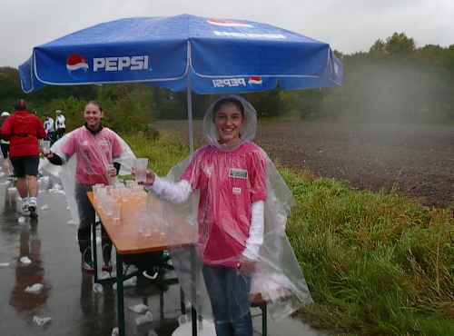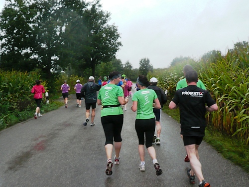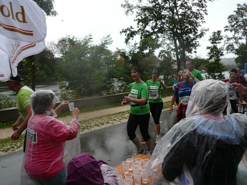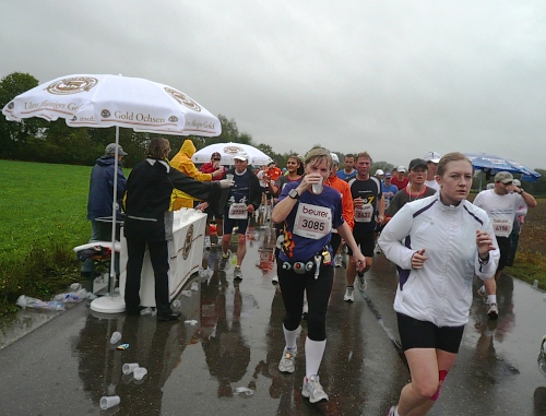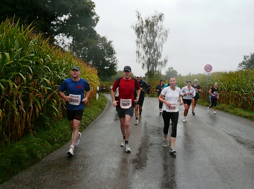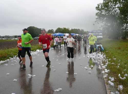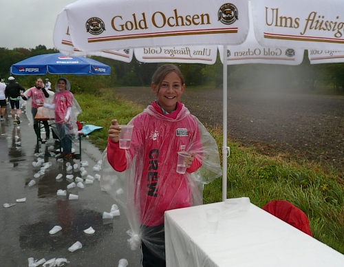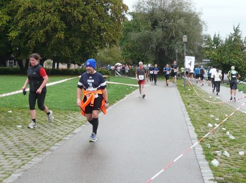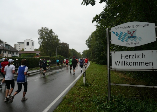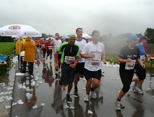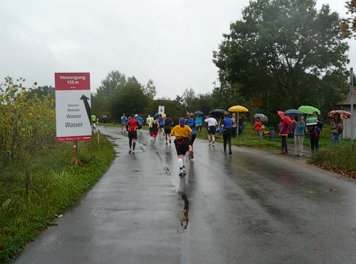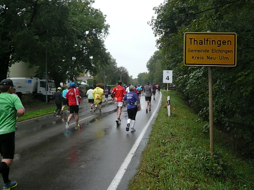 Kurz hinter km 3 liegt auf der bayerischen Seite der Pfuhler Badesee. Einen Kilometer später verlassen wir Baden-Württemberg und reisen in Thalfingen nach Bayern ein. Hier streifen wir nur den Ort und laufen noch kurz vor km 5 über die Donau. Selbst hier am Ortsrand stehen Zuschauer mit Schirmen und applaudieren uns zu. Klasse. Kurz hinter km 5 verlassen wir die Hauptstraße und biegen auf den Pfuhler Weg ab. Hier befindet sich der erste Verpflegungspunkt. Es gibt Wasser und Iso-Getränke. Alle Versorgungsstationen werden 150m vorher mit großen Tafeln angezeigt. Vorbildlich. Hinter der Versorgungsstelle warten zwei Bikerinnen auf den oder die letzte Läuferin. Am Rad haben sie eine Tafel mit Schlussläufer. Sie müssen sich noch gedulden, denn der langsamste Halbmarathoni benötigt heute im Schnitt 14 ½ Minuten für den Kilometer.