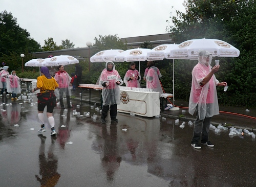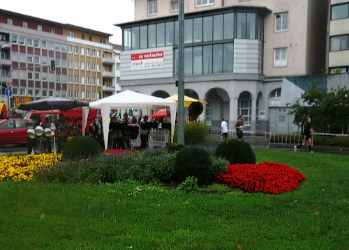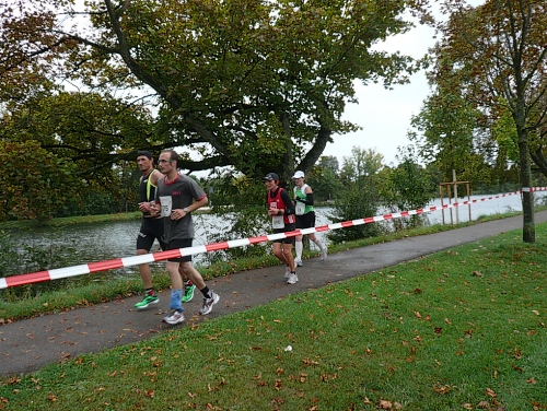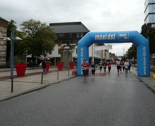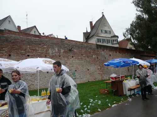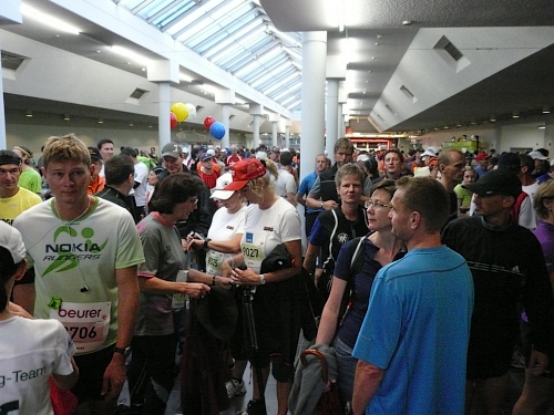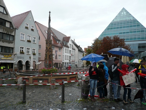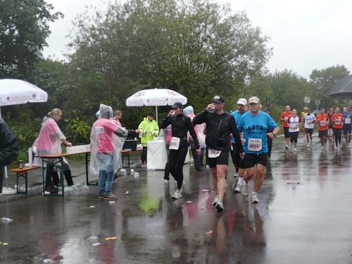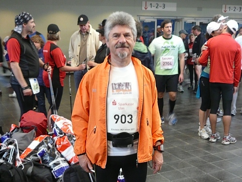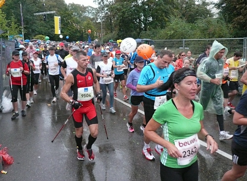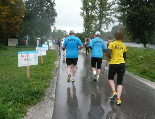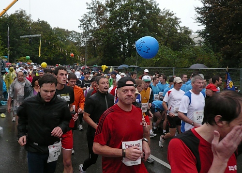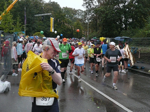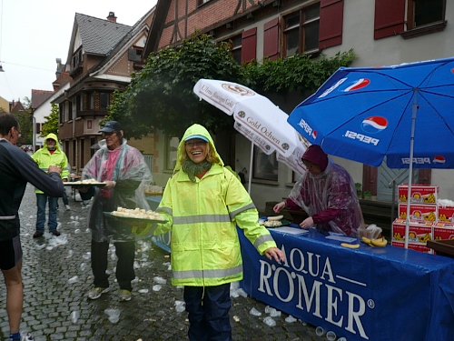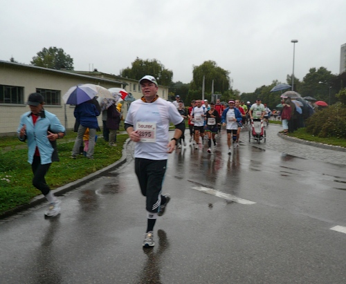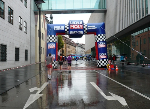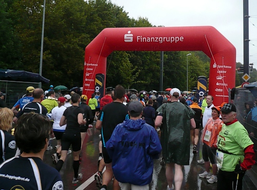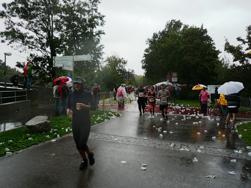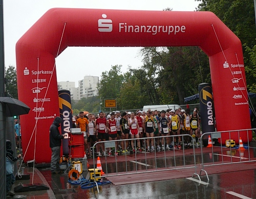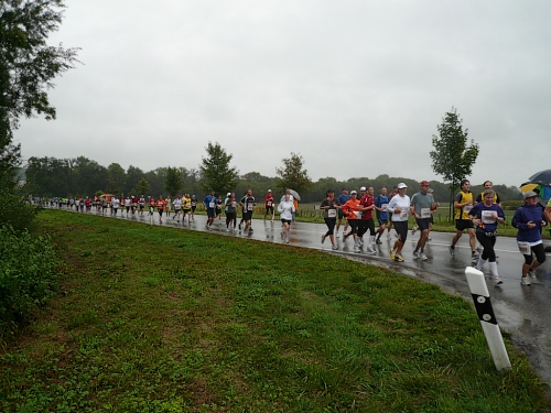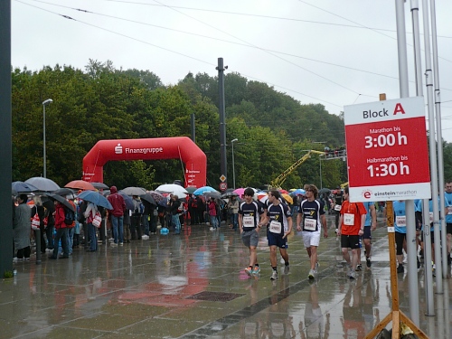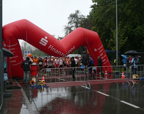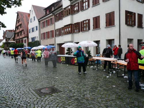 Aber so kurz vor 9 Uhr müssen wir raus in den Regen. Es ist ja nicht nur der Regen, auch die Temperaturen sind gefallen. Wir haben nur noch um die 13 Grad. Es gibt verschiedene Startblöcke je nach Zielzeit, die schon in der Anmeldung genannt werden musste. Die Pacemaker haben sich in den entsprechenden Blöcken entsprechend verteilt. Es gibt heute eine besondere Wertung für die „7 schnellen Schwaben“. Hierbei werden in Kooperation mit dem Augsburger-Friedensmarathon die 7 schnellsten Schwaben und die 7 schnellen Schwäbinnen gesucht. Durch das Programm führt der in ganz Deutschland bekannte Sprecher Artur Schmidt. Mit seinem großes Laufsport-Wissen kann er stundenlang Zuschauer und Läufer informieren und unterhalten.