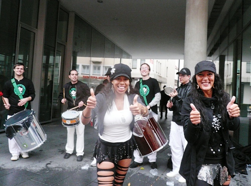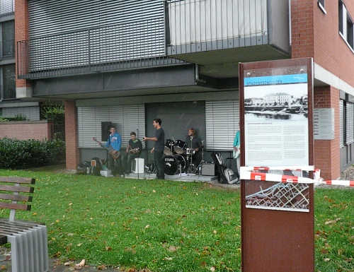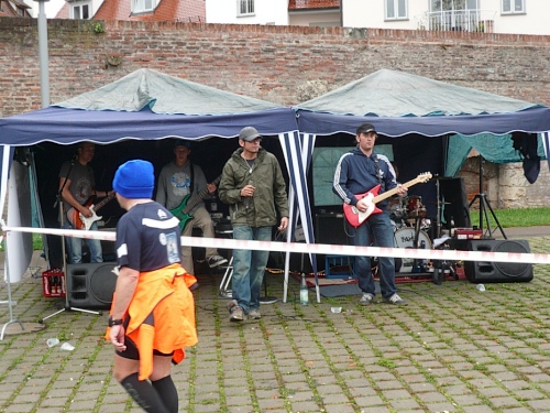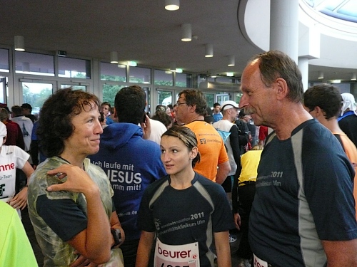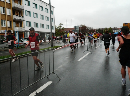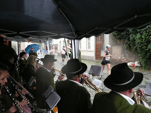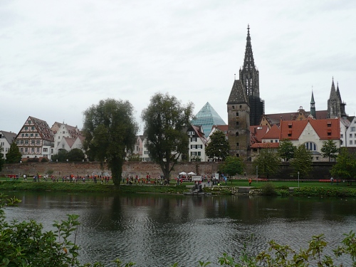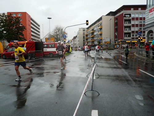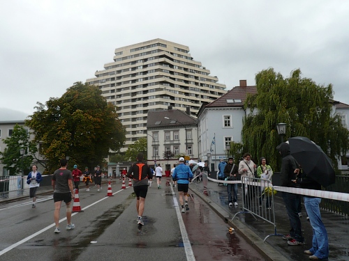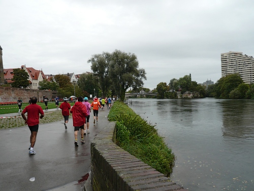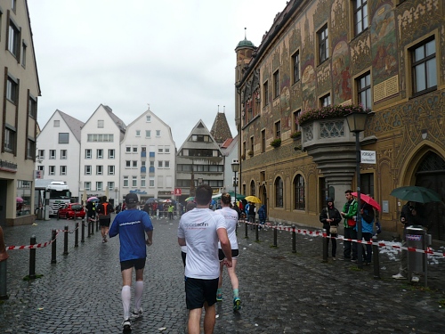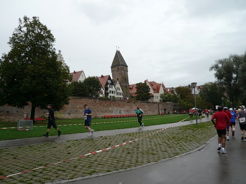 Für uns heißt es ein Stück an der kleinen Donau entlang und dann über die Herdbrücke rüber nach Ulm in die Neue Mitte, zu einer kleinen Schleife. Dabei kommen wir an historischen Gebäuden und moderner Architektur vorbei. Die Stadt hat hier auf ganz ungewöhnliche Weise ein Ensemble zwischen Renaissance und Moderne erbaut, nach dem Motto „Mittelalter trifft Moderne“. Es geht an der modernen Kunsthalle Weishaupt vorbei. Hierbei überlaufen wir auch die Startmatte vom 10km Lauf. Auch gibt es wieder viele Live-Bands, die trotz des Wetters alles geben. Viel Rockmusik zum Anfeuern.