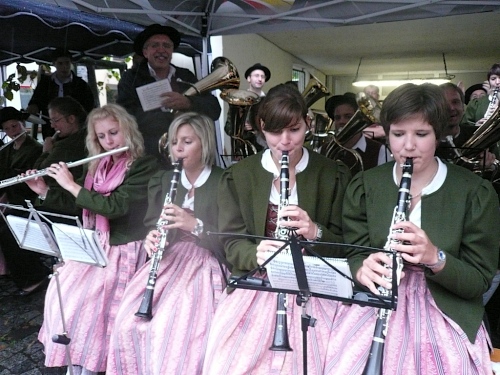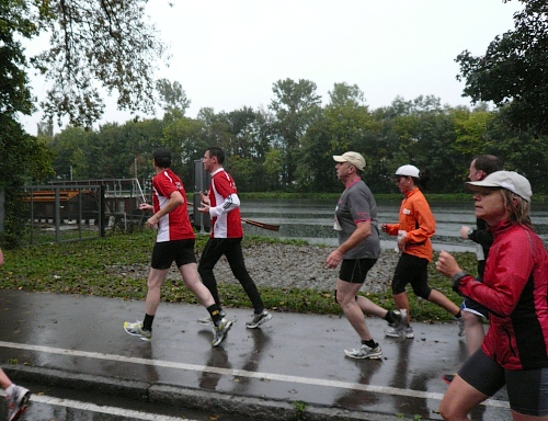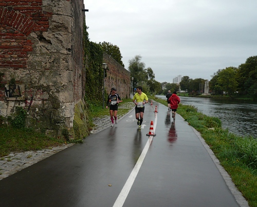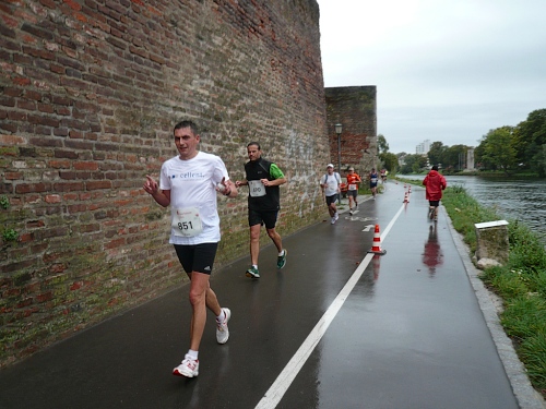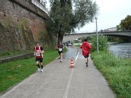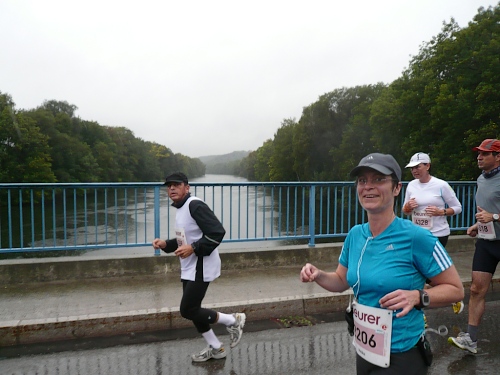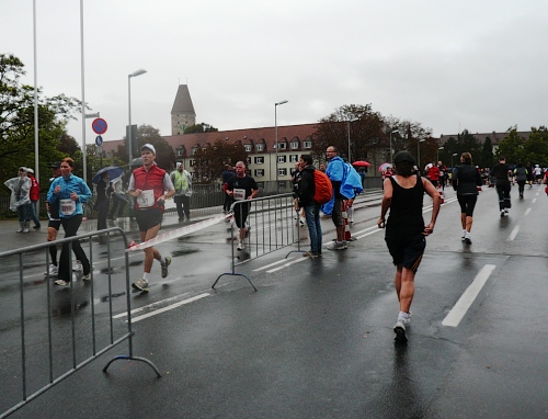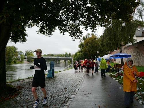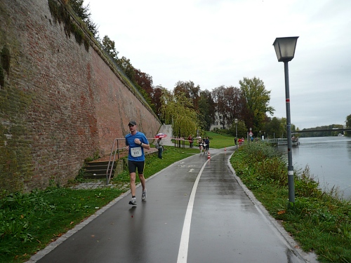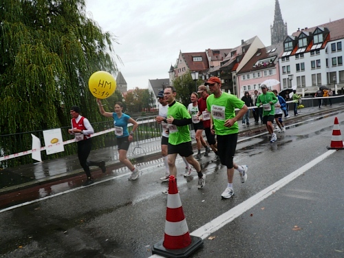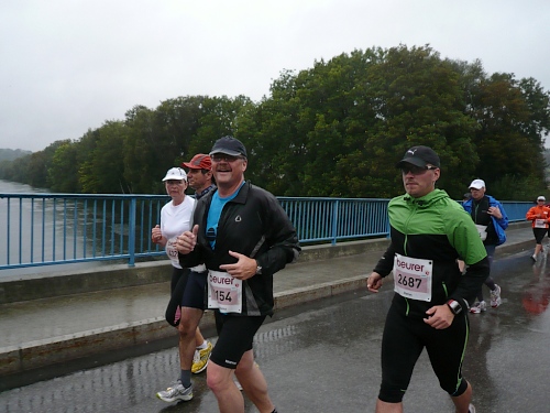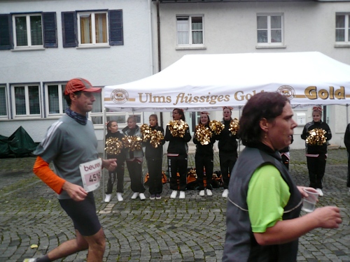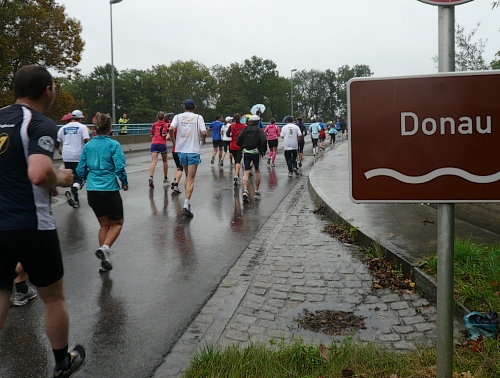 Bei km 11 kommen wir an den Sportplatz von Offenhausen zum nächsten Verpflegungspunkt. Hier kommt jetzt zum Regen auch noch ein heftiger Wind. Es ist, als würde es gleich Nacht. Hier spielt der Musikverein Wettenhausen. Alle Achtung, bei so einem Wetter und kalten Fingern. Jetzt, wo wir in den Stadtbereich kommen, gibt es auch laute elektrische Life-Musik. 30 Bands bzw. Musikgruppen haben sich angesagt, um uns und die Zuschauer zu unterhalten. Auch Offenhausen gehört zu Neu-Ulm. Wir laufen in Offenhausen zum Augsburger Torplatz. Hier erklimmen wir die 1912 erbaute Gänstorbrücke und überqueren die Donau von Neu-Ulm nach Ulm.