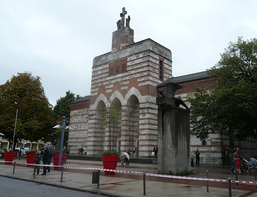 Wir wechseln schon wieder das Bundesland und laufen nach einem kurzen Gegenverkehrsstück runter an die Donau. Es geht ein Stück am Ufer entlang zur ca. 400m langen Insel. Gegenüber auf der anderen Donauseite sehen wir die schnellen Läufer die Halbmarathonis, die es nicht mehr weit zum Ziel haben. Auf der Schwal, der Spitze der kleinen Insel, steht das mächtige Kriegerdenkmal.