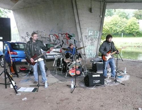 Am Zusammenfluss kurz vor km 39 ist der Weg wieder asphaltiert. Unter der Adenauerbrücke ist eine Band die lautstark und unermüdlich auch für die Langsamen immer noch alles gibt. Danke, Jungs und Mädels.