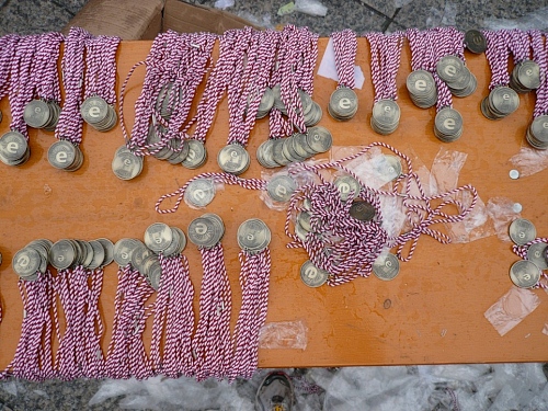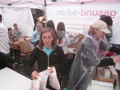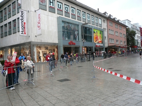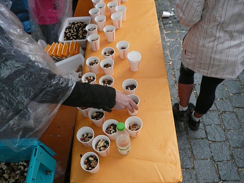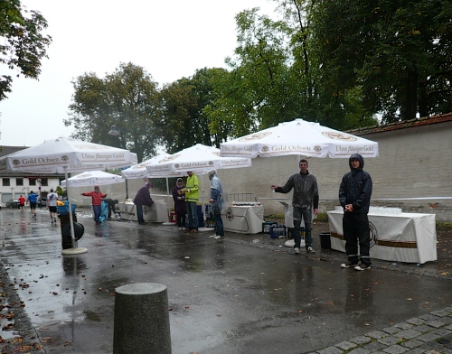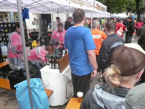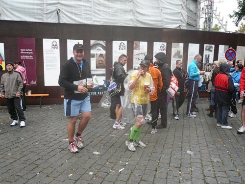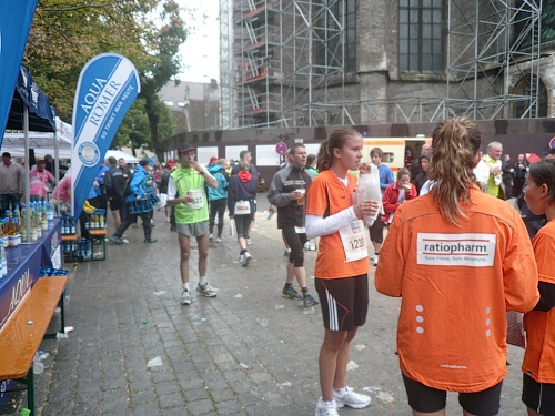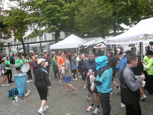 Mit der Medaille geht es um das Münster rum. Auf der Rückseite ist ein großer abgesperrter Zielversorgungsbereich. Hier gibt es alles, was das Herz begehrt, sofern einen die drängelnden 10er und Walker auch mal dran lassen. Ich hole mir ein Regenerationsbierchen, und wähle aus dem Riesenangebot Nüsse und Kuchen.