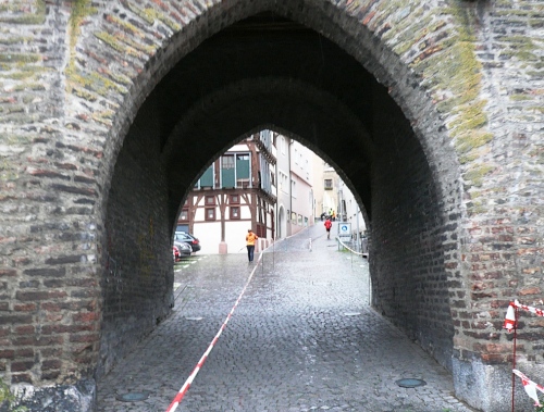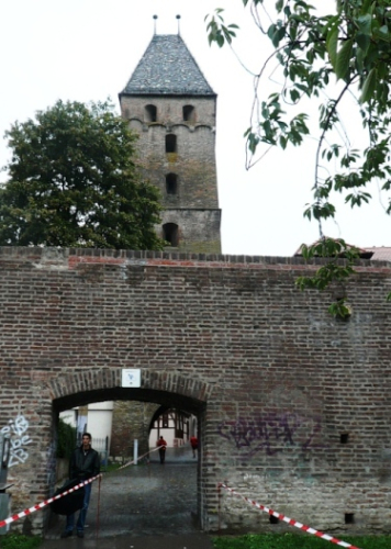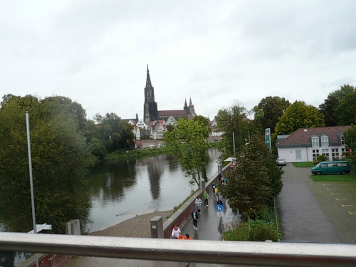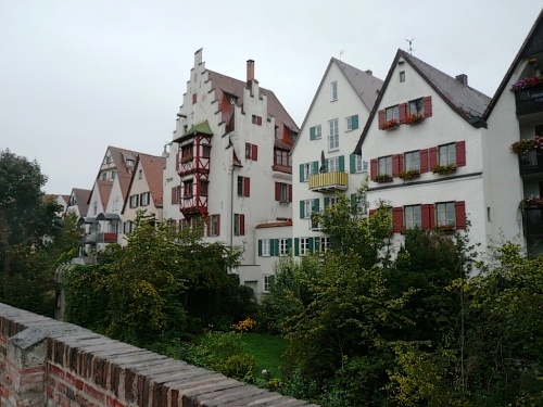 Es geht kurz steil hoch zum hinteren Teil vom Rathaus und durch eine Gasse kommen wir auf den Weg auf der alten Backsteinmauer. Die Stadtmauer wurde 1482 als Schutz gegen feindliche Armeen in das damals reissende Wasser der Donau gebaut. Rechts unter uns liegt das Fischer- und Gerberviertel, ein im Mittelalter vorwiegend von Handwerkern besiedeltes Viertel. Am Donauzufluss der Blau weisen noch viele alte und gut restaurierte Gebäude und die vielen verwinkelten Gassen auf diese Zeit hin.
