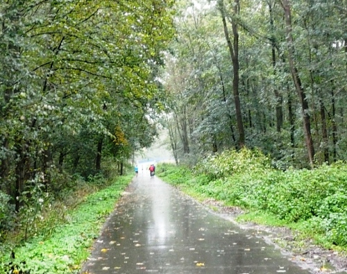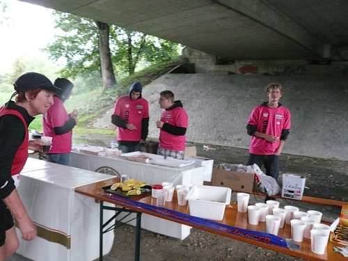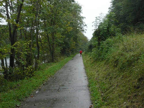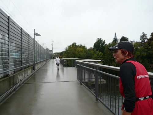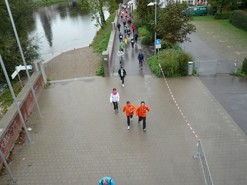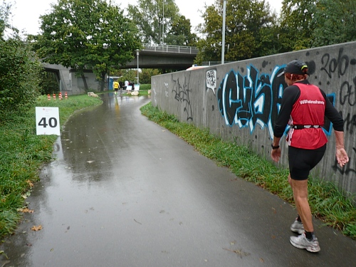 Kurz vor Ende der Stadtmauer ist der Km 26. Nochmal Wasser tanken und dann wieder runter zur Donau. Es begegnen uns jetzt die letzten Halbmarathonis und Nordic-Walker auf dem Weg zum Ziel. Dann geht es unter der Adenauerbrücke durch und weiter am Wasser entlang auf einem Radweg. Links die Donau rechts die Bahngleise und noch immer von oben der Regen. Nach 2km bei km 28 sehen wir auf der anderen Donauseite den Zufluss der Iller in die Donau. Es geht weiter über asphaltierte Radwege in einer Schleife wieder zur Donau. Hier am Kraftwerk überqueren wir die Donau.