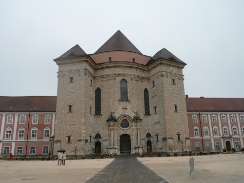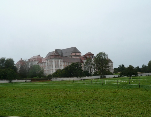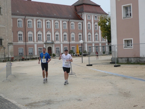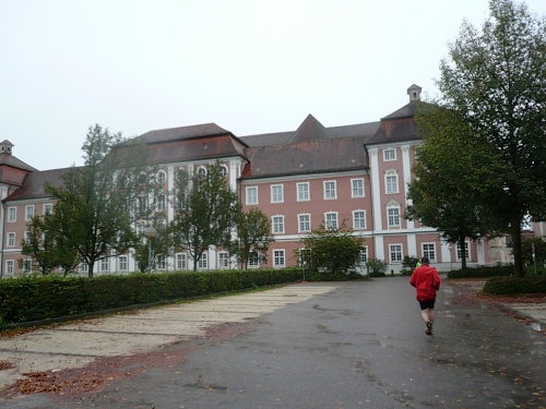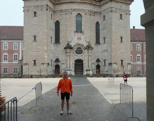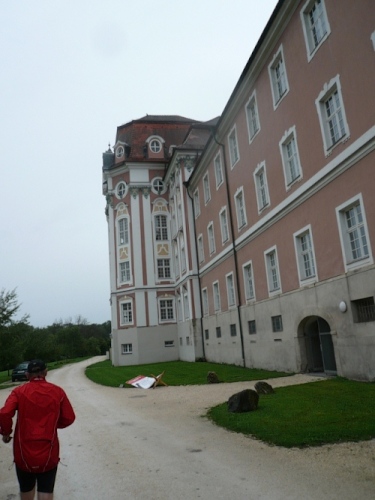 Die Strecke führt uns ca. 1km auf der Innenseite des Donaukanals entlang. Dann kommen wir nochmal kurz an die Donau und unterqueren die B 30 und erreichen das Industriegebiet von Wiblingen. Hier am nächsten Versorgungspunkt Rote Wand wird uns auch alkoholfreies Bier angeboten. Die nächsten 4km geht es am Rand von Wiblingen entlang. Kurz hinter km 34 erreichen wir nach einem Bergaufstück das Wiblinger Benedikinerkloster. 1093 stifteten die Grafen Hartmann und Otto von Kirchberg diese barocke Anlage der damaligen Landbevölkerung. Wunderschön ist das Innere der Klosterkirche mit der Kanzel von Fidel Sporer. Ein besonderes Prunkstück ist jedoch der Bibliotheksaal im Nordtrakt des Klosters. Nachdem wir es fast umrundet haben, geht es in den riesigen Innenhof, der heute menschenleer ist.