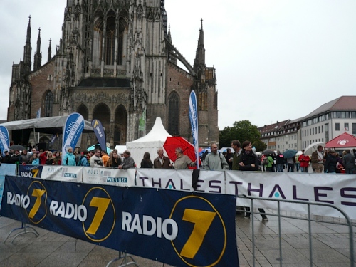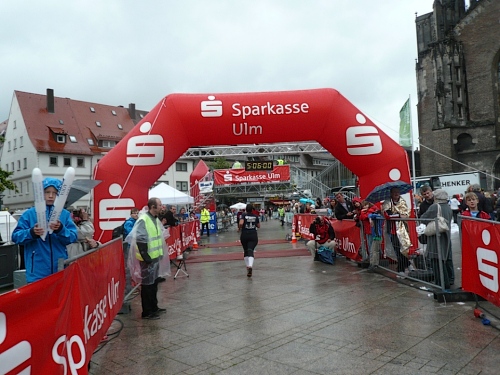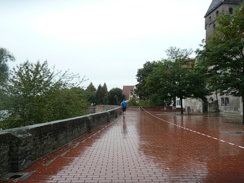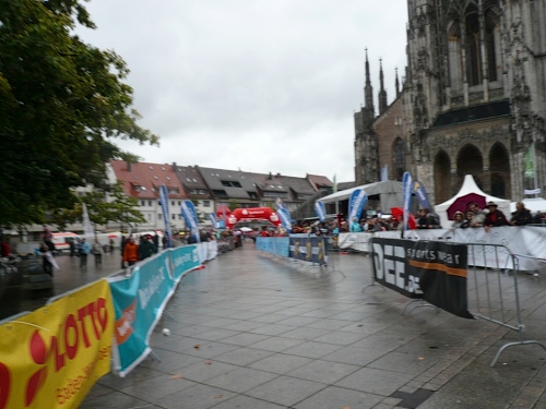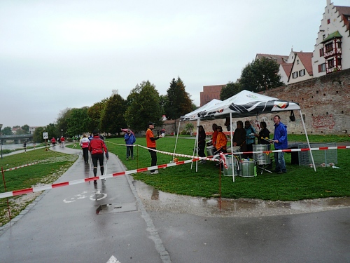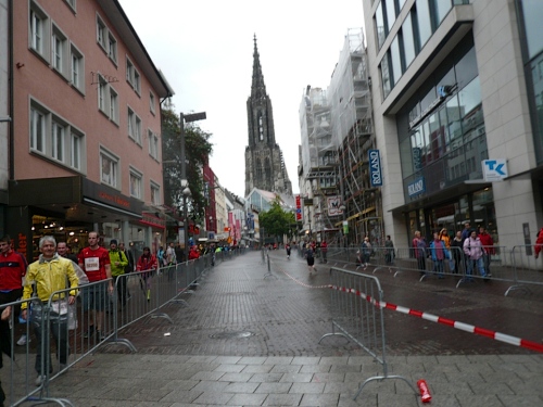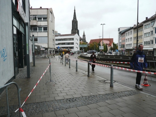 Bei km 18 kommen wir neben der Herdbrücke wieder ans Ufer der Donau. Der Regen hat mal nachgelassen und es gibt einen schönen Blick über die Donau rüber zur Stadtmauer und im Hintergrund den Münster-Turm. Davor steht der Metzgerturm den wir später noch durchlaufen werden. Es geht einen Kilometer flussaufwärts, bis wir bei km19 über einen Steg die Donau überqueren auf die Ulmer Seite. Am Donauturm steht die nächste Versorgungstelle. Nach dem Auftanken von Flüssigkeit geht es am Ufer entlang. Ein Schild weist darauf hin, das sich gleich die Halbmarathonis und Marathonis trennen müssen. Hier bei km 20 laufen die Halbmarathonis einen Return und biegen durch die Stadtmauer ab, um in einer Schleife das Ziel am Münster bzw. auf dem Münsterplatz zu erreichen.