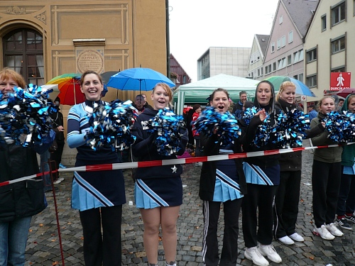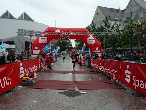 Dann geht es auf den Münsterplatz zum Zieltor. Juchhu, Nr. 96 geschafft. Ich habe die Laufzeit von 6 Stunden nicht ausgeschöpft. Irene und ich sind netto noch unter den 5 Stunden geblieben. Irene hat damit die W70 gewonnen. Herzlichen Glückwunsch. Ich bin erstaunt, dass jetzt noch so viele Zuschauer im Zielbereich sind, denn nach mir kommen nur noch wenige Marathonis. Nach Rückfrage mit einigen Zieleinläufern ist es aber so, das noch ein Teil des später gestarteten 10km Laufes und des Nordic-Walking unterwegs sind. Aber egal, ich freue mich über jeden der uns im Ziel beklatscht.
