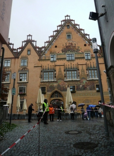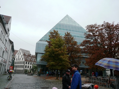 Wir laufen direkt auf das Stadthaus zu. Der New Yorker Stararchitekt Richard Meier hat hier 1993 einen architektonischen Gegenpol zu dem dahinter liegenden spätgotischem Münster entworfen. Auf diesem Platz stand früher das Barfüßerkloster, was wegen der freien Sicht auf das Münster abgerissen wurde. Seit 1924 gab es 467 Entwürfe. Meier sollte eine „begehbare Skulptur“ mit Platz für Ausstellungen, Konzerte, Tagungen, Vorträge etc. entwerfen, in dem auch die Touristeninformation wieder enthalten ist sowie auch eine Gastronomie. Es war viele Jahre umstritten, aber auch der Neubeginn einer Ansammlung von architektonisch ungewöhnlich neuer Gebäude in Ulms Neuer Mitte.