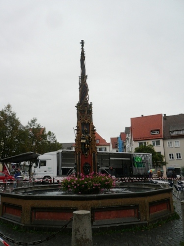 Jetzt geht es erst mal in einer kleinen Schleife durch Neu-Ulm zum nächsten Versorgungspunkt am Rathaus. Hierbei umlaufen wir die im expressionistischen Stil erbaute St. Johann Baptist Kirche. Dominikus Böhm, ein bedeutenden Kirchenbauer der 20er Jahre, schuf hier auf den Ruinen einer ehemaligen neuromanischen Kirche ein imposantes Gotteshaus. Sehenswert sind das dreiteilige Portal und die Kreuzigungsgruppe als Krönung. Sie gehört weltweit zu den bedeutendsten Kirchenbauten des 20. Jahrhunderts, was Besuche von Architekten und Kunstsachverständigen aus der ganzen Welt bestätigen. Vor der Kirche steht ein geflügelter Markuslöwe mit aufgeschlagenem Evangelienbuch. Den geflügelten Markuslöwen finden wir im Alten Testament bei Ezechiel, 4,7-9 wo es heißt: Das erste glich einem Löwen, das zweite einem Jungstier, das dritte hat ein Gesicht wie ein Mensch, das vierte war gleich einem fliegenden Adler.