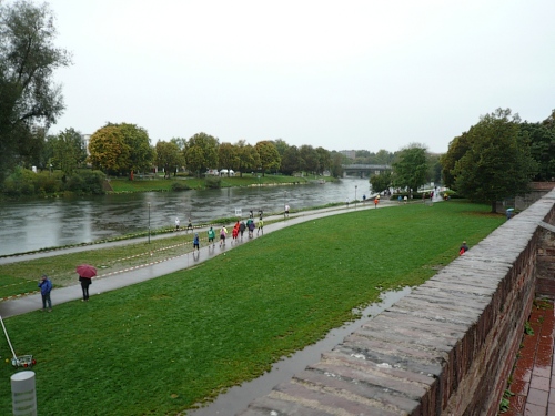 Wir folgen dem Donauufer weiter flussabwärts auf einem Spazier- und Promenadenweg. Beim Blick nach links oben sehen wir einige Marathonis, die auf der alten Stadtmauer schön in die Südschleife laufen. Für mich geht es erst mal weiter in die knapp 6km lange Wendeschleife gen Norden. Hier kommen mir jetzt Marathonis entgegen, die schon den 25. Km hinter sich haben. Zur linken begleitet mich jetzt die Stadtmauer und zur rechten die Donau. Bei diesem Wetter nutzt keiner den herrlichen Promenadenweg. Hier links an der Mauer muss das Schild vom Schneider von Ulm sein, wo er seinen Flugversuch hatte. Es geht unter der Gänstorbrücke durch und dann kommt die Halbmarathonmatte. Es beginnt die 2. Hälfte. Jetzt ist links die Parkanlage Friedrichsau und rechts bleibt uns die Donau erhalten.