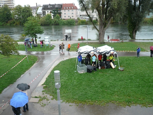Hier laufen wir fast bis zu unserem Startplatz an der Donauhalle. Kurz vor dem nächsten Erfrischungsstand wird mir der Laufweg kurz versperrt, aber die zwei Enten watscheln dann doch runter ans Wasser. Es geht weiter direkt neben der Donau. Dann auf der Höhe vom Zirkus Knie geht es in einem Return auf den anderen Fußweg und es beginnt der Rückweg zur Innenstadt. Hier kann ich sehen, das es auch noch einige langsamere Läufer gibt. Und dann kommt auch eine die Radfahrerin, die den Schlussläufer begleitet.
