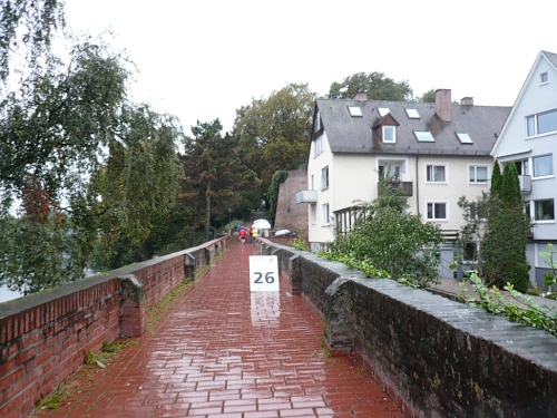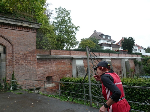 Es geht nochmal durch ein altes Backsteinstadttor und dann hoch auf die Brücke. Beim Blick nach unten sehen wir Läufer vom 10km Lauf und 10km Walker die ungefähr 2/3 ihrer Strecke hinter sich haben. Kurz hinter der Brücke kommt das 41km Schild und wieder Schotter, Steine und Matsch. Hier heißt es gehen und nicht wegrutschen, denn rechts geht es abwärts. Die Schuhe sehen aus wie nach einem Crosslauf.