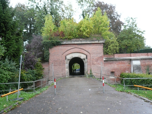 Es geht weiter dem Fluß entlang. Kurz hinter der Gänstorbrücke begleitet uns jetzt wieder die Stadtmauer. Wir kommen zur geschichtsträchtigen Adlerbastei. Hier hatte der Schneider von Ulm seinen missglückten Flugversuch 1811. Vorhin, beim Hinweg, habe ich das Schild nicht gesehen aber jetzt entdecke ich das kleine unscheinbare Schild an der Mauer.