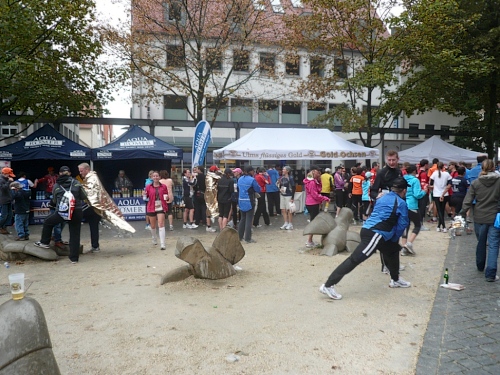 Dann geht es auch am Ulmer Rathaus vorbei. Die Außenbemalung des 1370 entstandenen Gebäudes zeigt die Handschrift der Frührenaissance. Wir werden später nochmal den hinteren Teil des Rathauses streifen. Hier gibt es auch eines der wenigen Kopfsteinplasterpassagen. Beim Überqueren der Herdbrücke blicke ich nach rechts runter zum Donauufer wo ein Gewusel von vielen Menschen ist. Hier ist die Weiche von Halb- und Marathon.