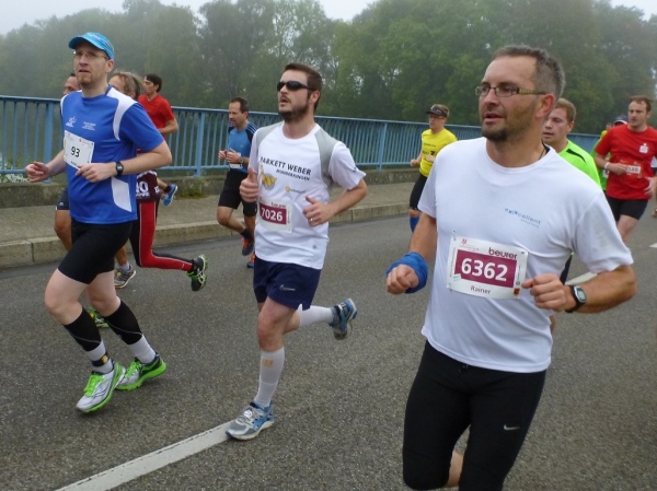 Gerade im Umfeld der Messe sind noch viele Zuschauer vorhanden, doch schon nach wenigen Hundert Meter Laufstrecke sind wir auf der Thalfinger Uferstraße allein unterwegs. Es ist nicht kalt, etwa 12, 13 Grad, aber keine Sonne, dafür Nebel satt. Aber windstill, gut für jene, die schnell laufen wollen. Schnell laufen wird man genau zur gleichen Zeit in unserer Bundeshauptstadt. Und da soll es in Rekordzeit ablaufen.