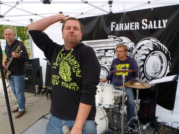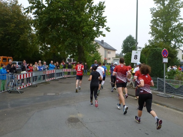Kilometer acht. In der Ortsmitte Pfuhl unterhält die örtliche Feuerwehrkapelle das Läuferfeld. Die erste Darbietung. Und haltet Euch fest, über 30 Bands und Tanzgruppen werden links und rechts der Strecke stehen und ihre Leistung erbringen, so wie wir. So eine Dichte gibt es nirgends. Seit 60 Jahren gibt es den Klangkörper, der damals von einigen Feuerwehrmännern gegründet wurde. Rund 40 Aktive stehen heute hinter den Instrumenten. Und der Nachwuchs steht auch schon in den Startlöchern. Dirigent Rainer Trometer (ohne p) geht noch einen Schritt zurück für ein passendes Bild.