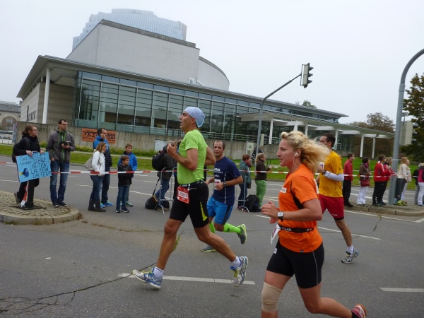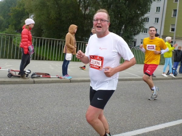 Kilometer 10, jetzt laufen wir direkt an der Donau. Links sind geschätzte 20, 30 von Kindern selbst bemalte Transparente zu sehen. „Mama, schneller, schneller“ oder „Papa, flitz“ ist zu lesen. Auf der gesperrten Augsburger Straße nähern wir uns der Innenstadt von Neu-Ulm. Die Gruppe Farmer Sally unterhält mit Cover Rock.