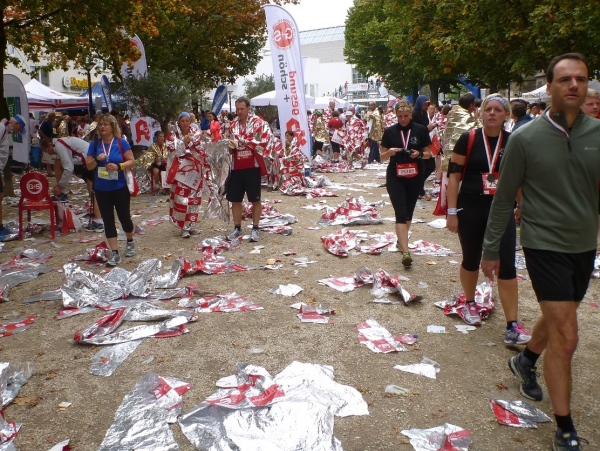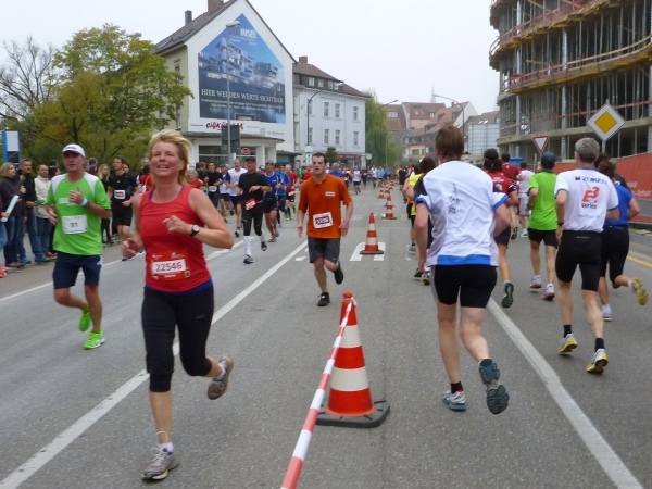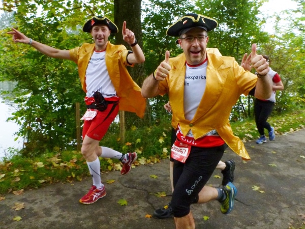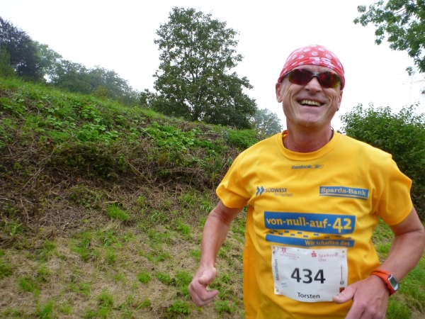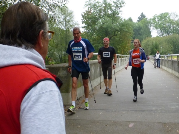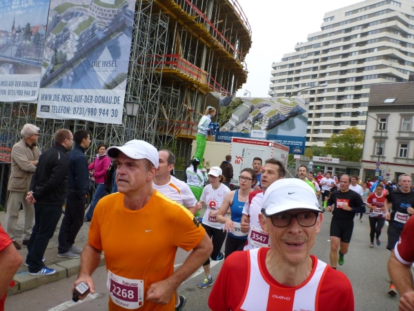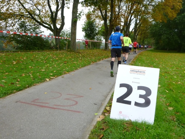 Etwa bei Kilometer 22,5 ist die Wende, ein paar Helfer passen auf, dass wir nicht abkürzen. Es geht zurück. Ein paar Verrückte der Kreissparkasse Köln laufen auf der anderen Seite noch in Richtung Wende. Die sind verkleidet wie Napoleon. Ja, heute laufen die Sparkassler ihre Meisterschaften über alle Distanzen aus. Deutlich über 2000 Banker sind nach Ulm gekommen. Am Abend werden die noch eine Siegersause abhalten.