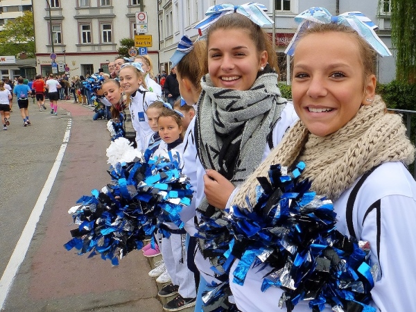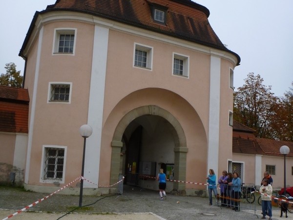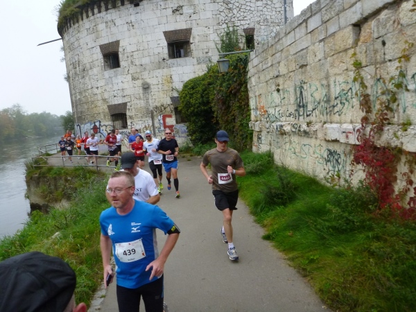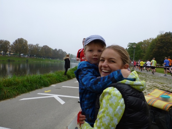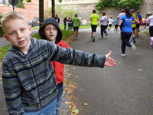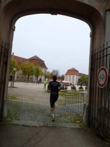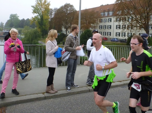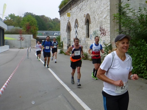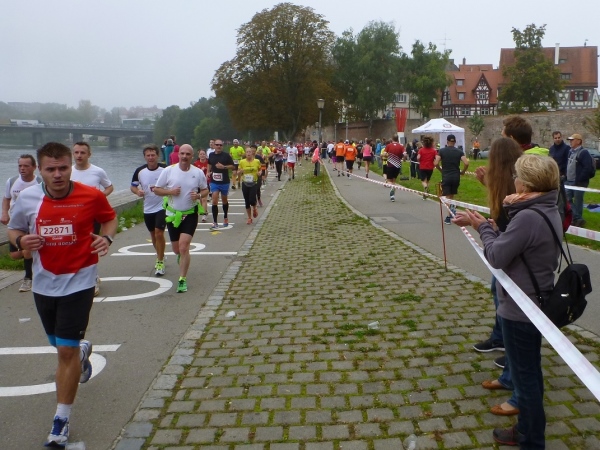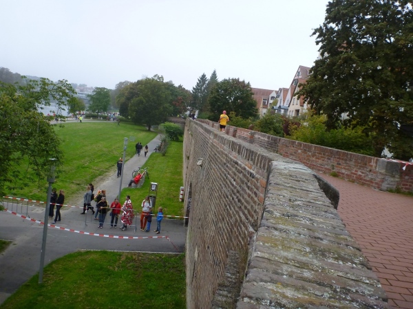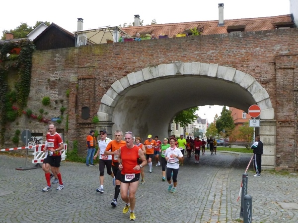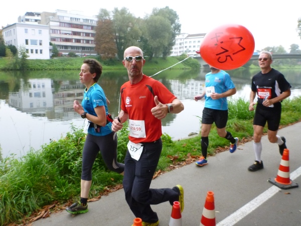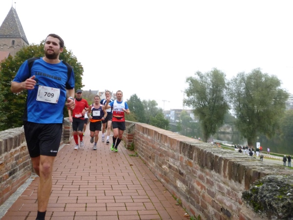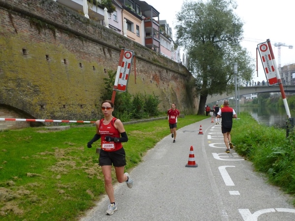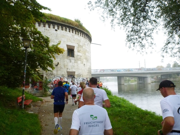 Am Steg bei der Adenauerbrücke überqueren wir ein weiteres Mal die Donau. Nun laufen wir an der Nordseite der Donau entlang der Oberen Donaubastion und der Stadtmauer. Musikkapellen im Abstand von 300, 400 Meter lassen die Luft beben. Dann heißt es Streckentrennung in 200 Meter. Die Halbmarathonis links, wir geradeaus. Helfer passen auf, dass keiner in die Irre geht.