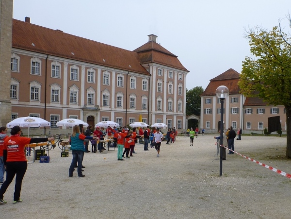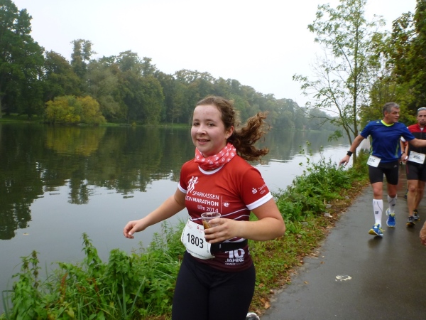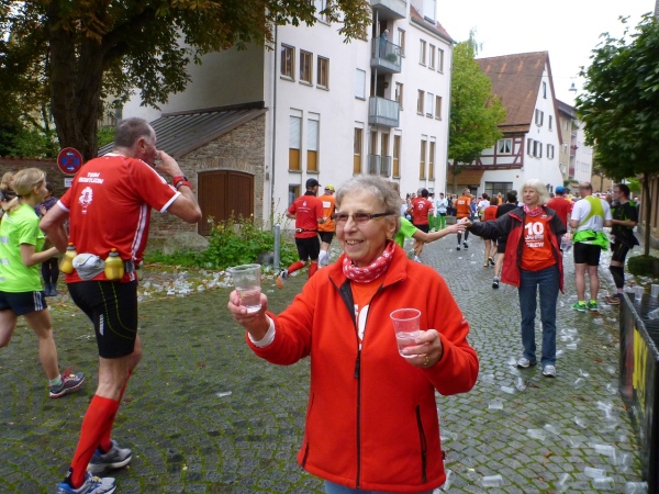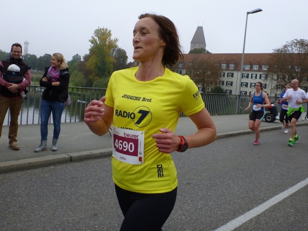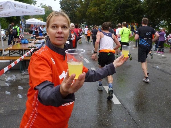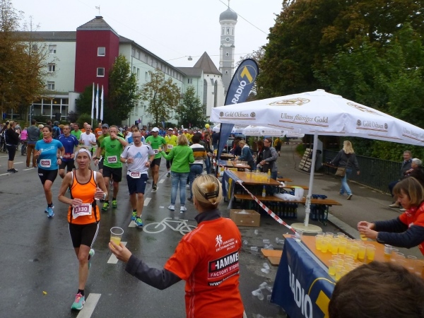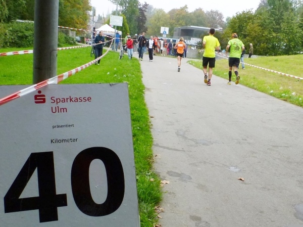 Kurz vor Kilometer 30 geht es an dem Donaukraftwerk über das Gewässer. Die folgende Trinkstelle ist wie geschaffen für mich, denn hier wird Bier gereicht. Da läuft es sich gleich leichter. „Du Temposau,“ ruft mir Charly Berger hinterher. Ein paar Minuten später laufe ich auf Kathrin Schramm auf, die auch schon mal für M4Y berichtet. „Du kommst wieder zu früh,“ muss ich mir anhören. „Und grüß mir meine Freundin Anja Völler, die ist weiter vorne.“ Mittlerweile haben wir den Ortsteil Wiblingen erreicht.