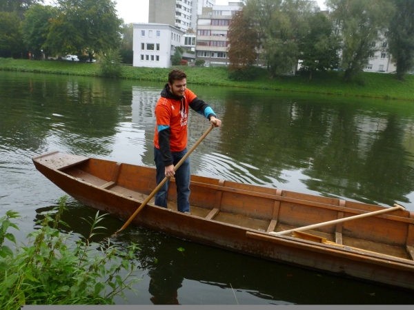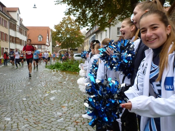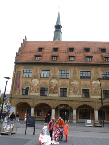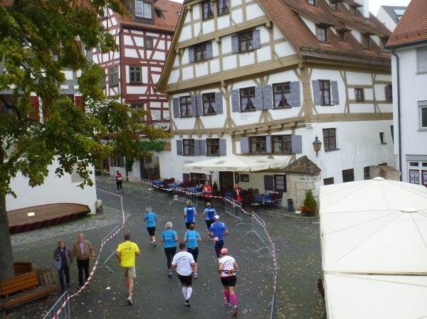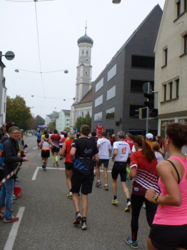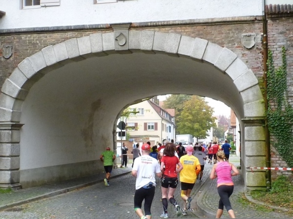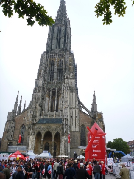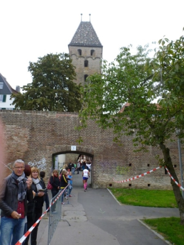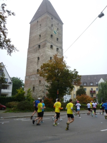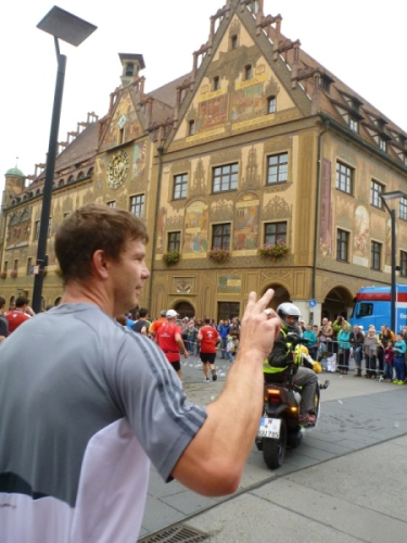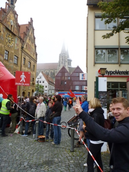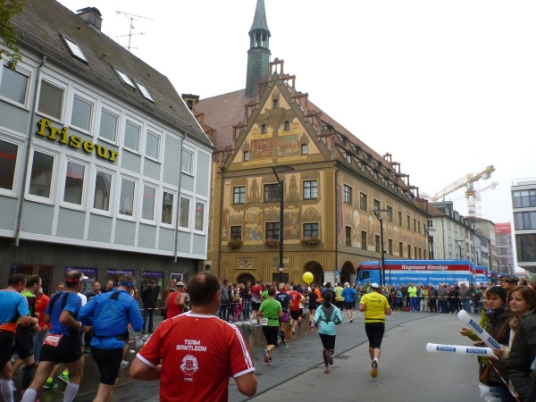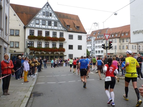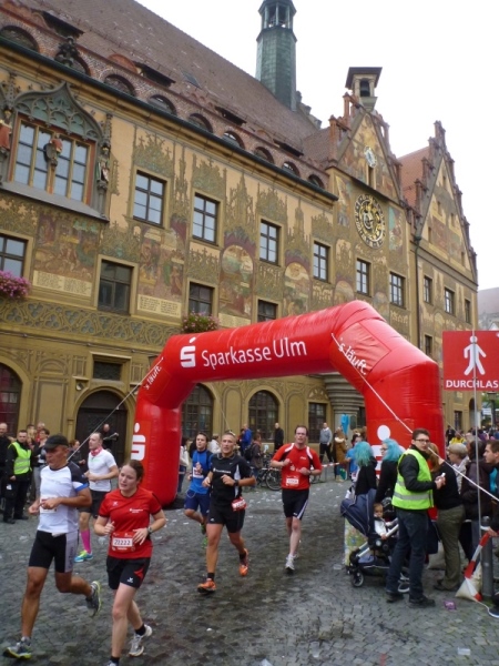 Kilometer 16. Weiter geht es mit der tollen Stimmung am Ulmer Rathaus im Herzen der Stadt. Natürlich stehen die Zuschauer dicht beieinander. Das Rathaus gilt heute wegen seiner Fresken und wegen der astronomischen Uhr als „Must See“ bei den Touristen und auch bei uns. Im 14. Jahrhundert wurde es erbaut und damals auch als Kaufhaus bezeichnet und benutzt. Eisen, Salz und später auch Fleisch gingen über den Tresen. Zwar wurde das Innere des Rathauses im Zweiten Weltkrieg zum großen Teil zerstört, doch das Äußere blieb stehen und so konnte in den ersten Jahren nach Weltkriegsende die Schäden beseitigt werden. Die wichtigsten Ämter und der Oberbürgermeister konnten 1951 wieder einziehen.