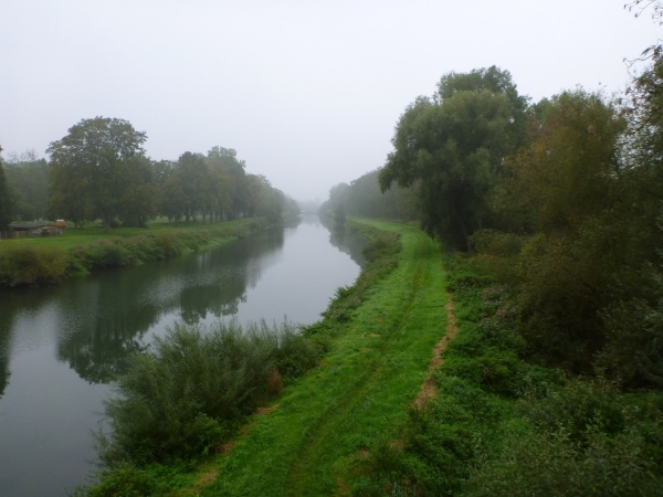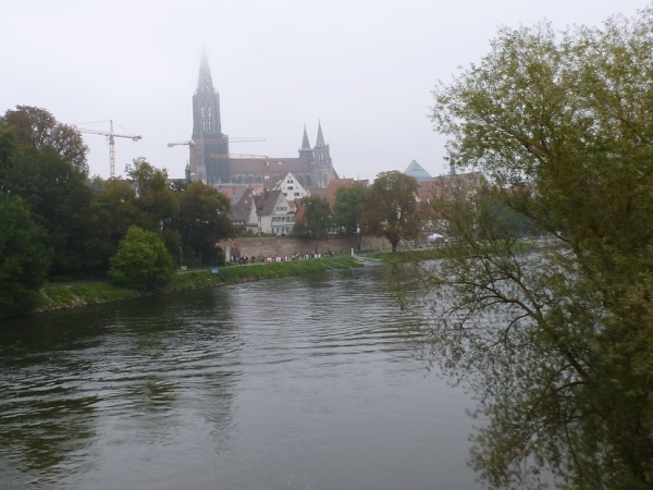 Wir biegen auf die Herdbruckerstraße ein, im Hintergrund kann ich die Spitzen des Ulmer Münsters gerade im Nebel noch erkennen. Wer weiß, ob die Suppe sich heute noch auflösen wird. Temperaturmäßig mit knapp unter 15 Grad sind die äußeren Bedingungen weiterhin klasse. Auf der Herdbrücke, wieder ein Gegenverkehrsbereich, laufen wir nach Neu-Ulm.