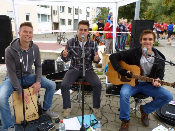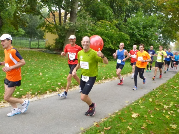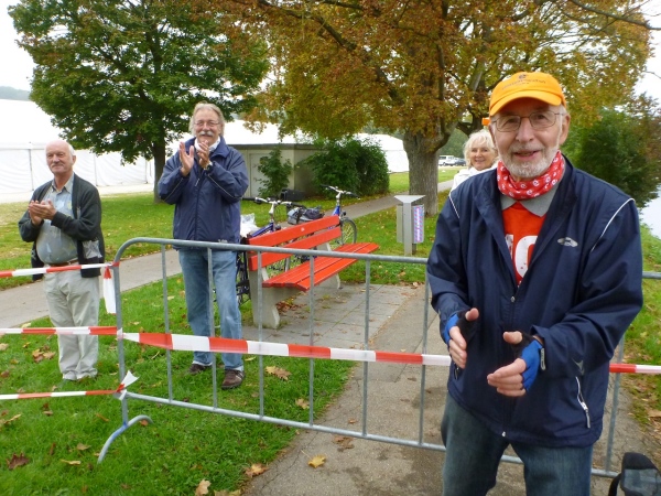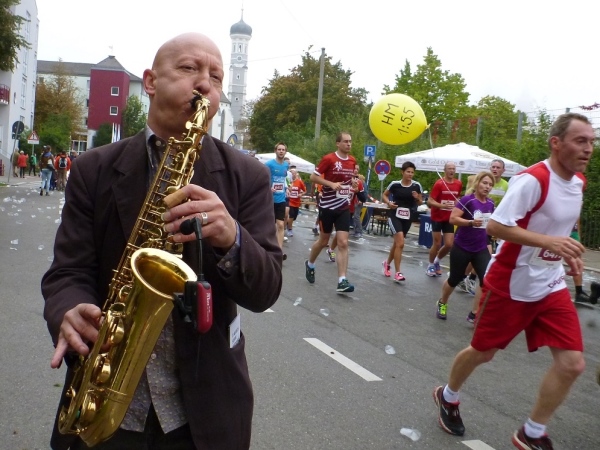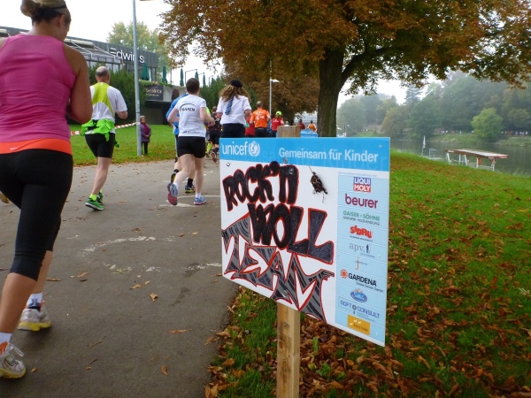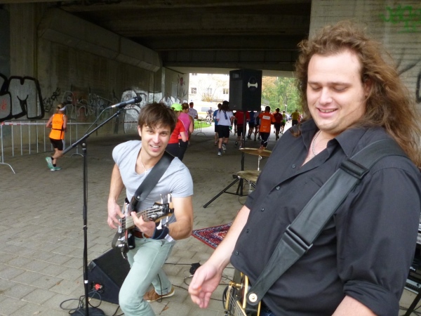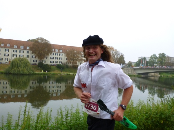 Auf dem geteerten Uferweg fällt mir ein langhaariger, mit einem weißen Hemd bekleideter Läufer auf, der eine kleine Gitarre mitschleppt. Tobias Spöcker vom Radio 7 Laufteam gibt sich als Fan von AC/DC aus und wird im Ziel ein „Highway to Hell“ anstimmen.