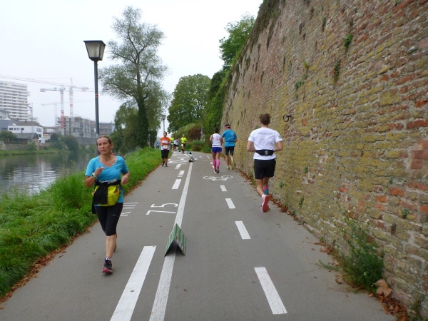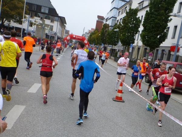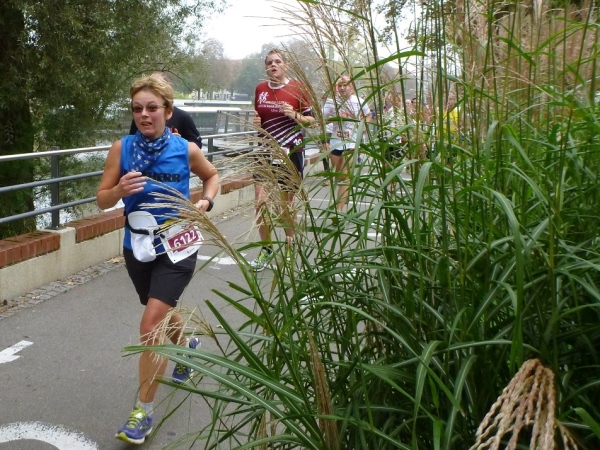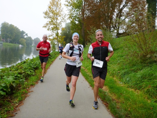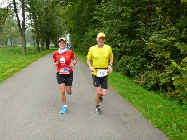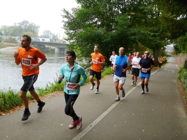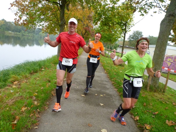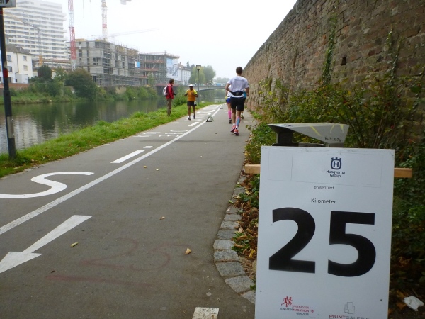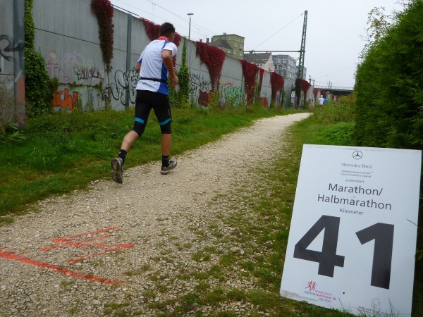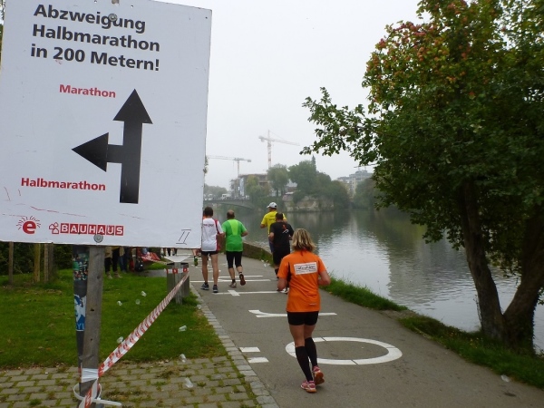 Das Feld dünnt sich gehörig aus, mindestens fünf zu eins. Der schmale Uferweg, vorher mit den Halbmarathonis schon an der Kapazitätsgrenze, reicht nun dicke für uns Marathonis, auch wenn die Schnellsten, darunter die 3.15er Gruppe mir schon entgegenkommen.