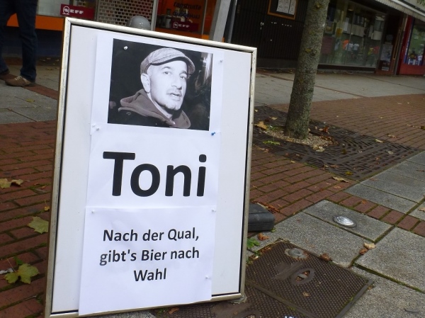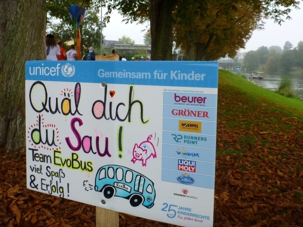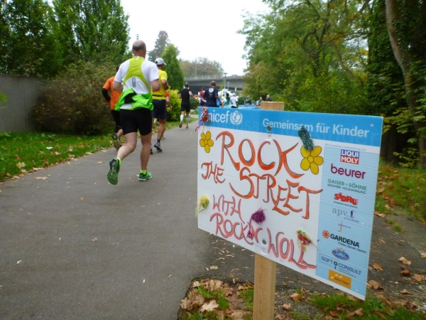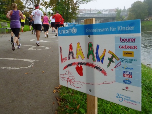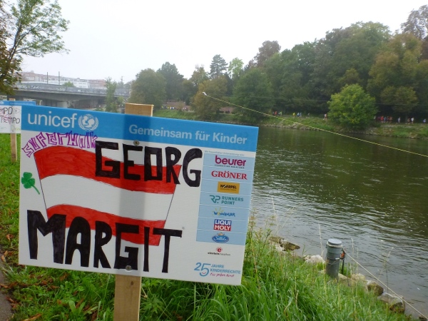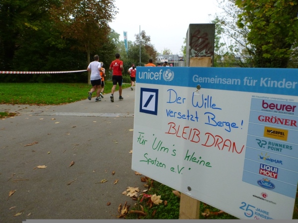 Nochmals laufen wir an den Schildern vorbei, die Kinder gemalt haben. Ich kann aber nicht sagen, ob die von vorher kurz eingesammelt und neu aufgestellt wurden, ist ja auch egal. „Bleib dran, der Wille versetzt Berge“, so heißt es. „Für Ulm's kleine Spatzen“, lese ich weiter, ein Verein, der sich die Aufgabe einer Unterstützung von Kindern in Notlage ins Handbuch geschrieben hat.