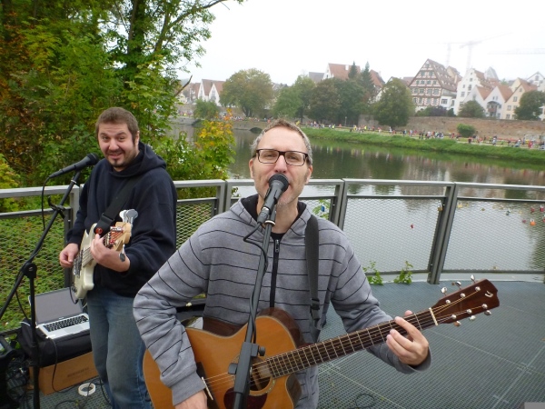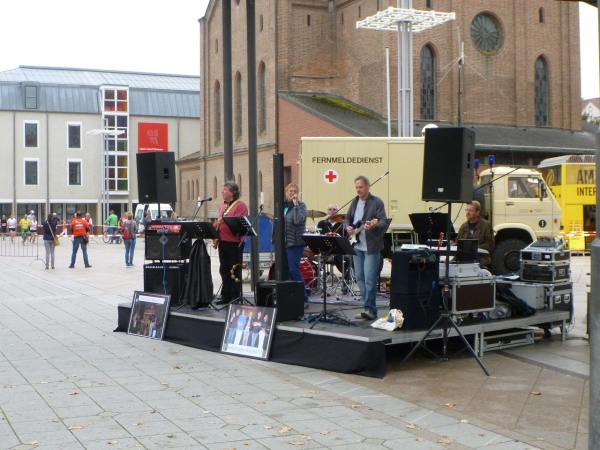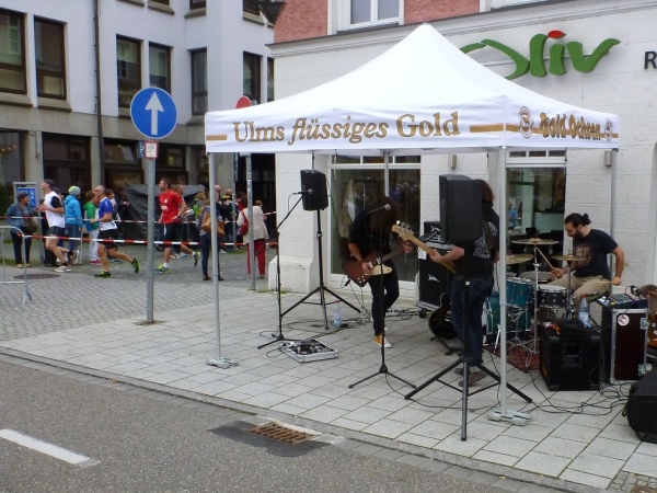 Eine kleine Wendeschleife in der Augsburger Straße, die Tankstelle am Rathaus und noch mal die Petruskirche sind die nächsten Streckenteile. Dann laufen wir über das Donaucenter ans Jahnufer. Und jetzt steigt nochmals die musikalische Unterhaltung. Diesseits und jenseits der Donau ertönt Musik. Es scheint, als wolle jede Kapelle die andere in Punkto Lautstärke übertreffen. Gänsehaut pur. Wer so etwas erleben will, dem empfehle ich Ulm uneingeschränkt.