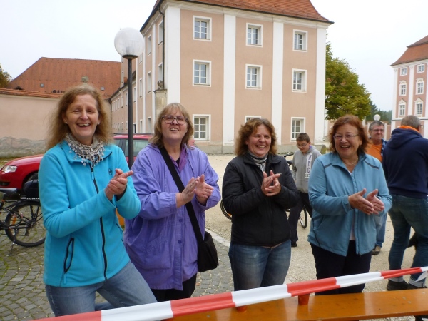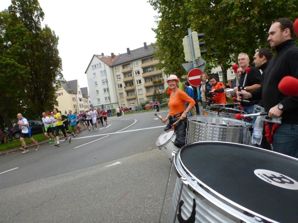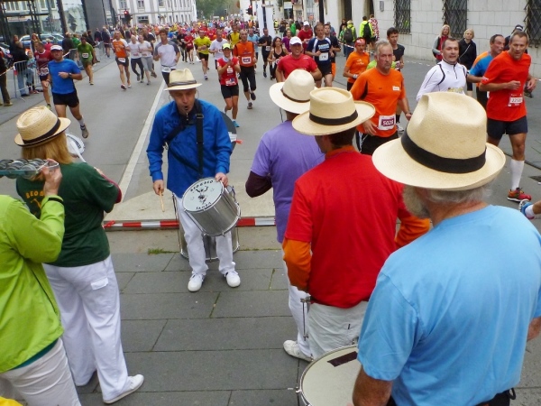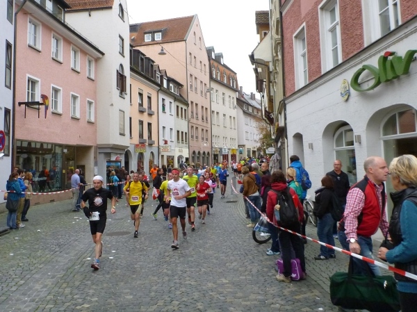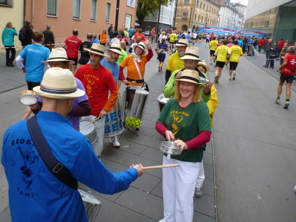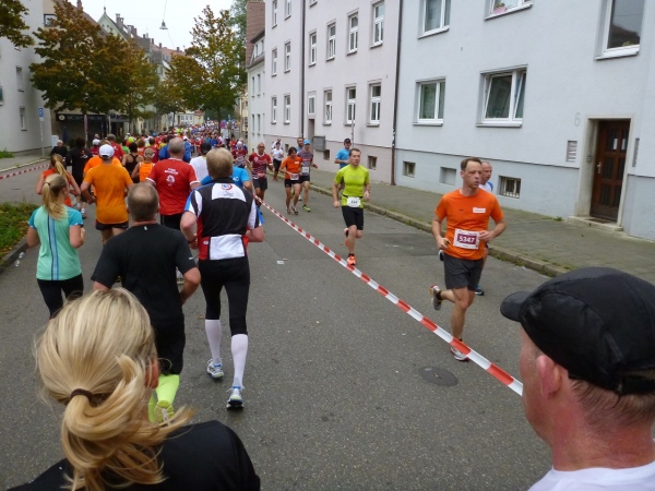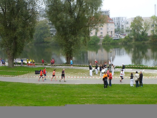 Ausgangs der Griesbadgasse, nun kurzzeitig Kopfsteinpflaster, kann man das Läuferfeld abermals in einem Gegenverkehrsbereich beobachten. Und dann gleich nochmal auf der Gänstorbrücke. Im 18. Jahrhundert wurde dieser Übergang immer wieder provisorisch durch einen Bau ermöglicht, meist, wenn die weiter westlich liegende Herdbrücke verbreitert wurde. 1910 wurde die jetzige Brücke nach langen Verhandlungen über Finanzierung und der wechselnden Verkehrsströme wieder neu errichtet. Die Band Ramba Samba macht hier Ramba Zamba, echt klasse, mit ihrem Trommelsound. Und, schwupps, sind wir wieder in Bayern.