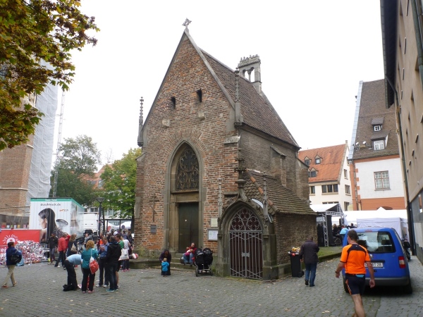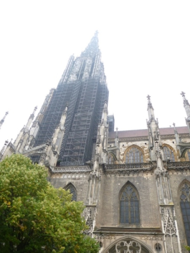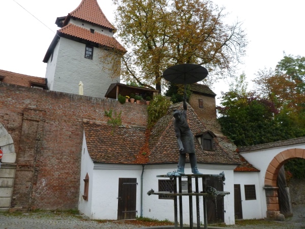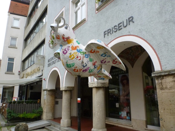 Auf unserer kurzen Runde sehe ich an der Musikschule den Ulmer Spatz, das Wahrzeichen schlechthin. Und dafür gibt es auch eine Geschichte: Beim Bau des Münsters hatten die Ulmer einen besonders großen und langen Balken angekarrt, mit dem sie nicht durch das Stadttor kamen. Als sie schon fast das Tor einreißen wollten, sahen sie einen Spatzen, der für seinen Nestbau einen Zweig längs im Schnabel hatte. Da ging ihnen ein Licht auf und sie legten den Balken der Länge nach auf den Karren.