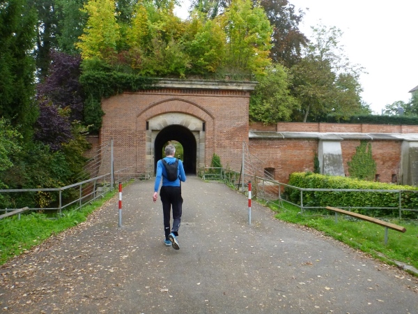 Noch vor Kilometer 40 laufe ich auf Anja Völler auf, die mich gleich weiterschickt. Bei der letzten Versorgung kommen die Helfer mit mir nicht ins Geschäft. Ich starte durch und laufe nun am Südufer der Donau durch die Halbbastion 9 mit dem Memminger Tor, einem Teil der Bundesfestung Ulm auf Neu-Ulmer Seite. Auf der anderen Donauseite befindet sich die Obere Donaubastion (Roxy).